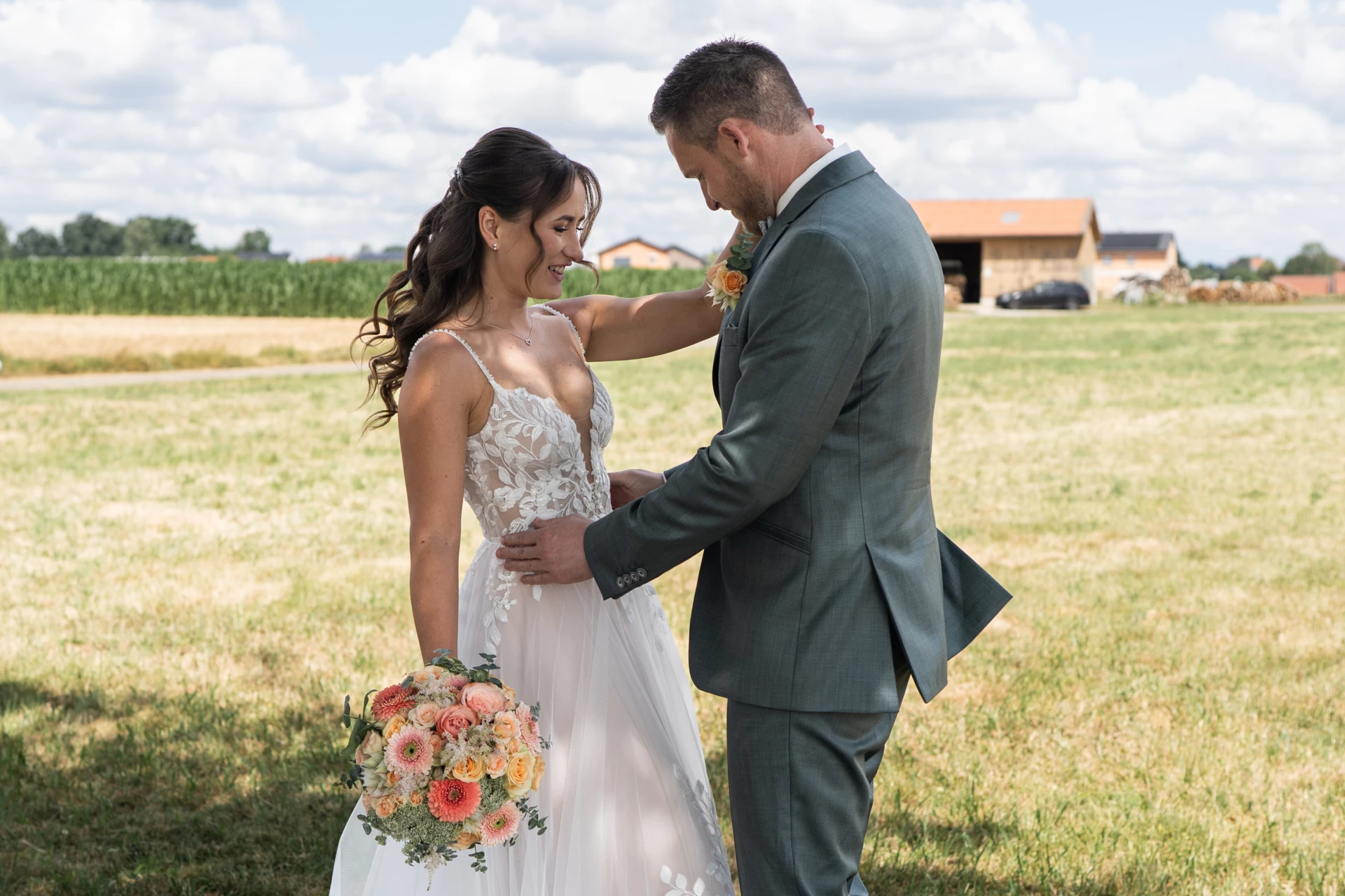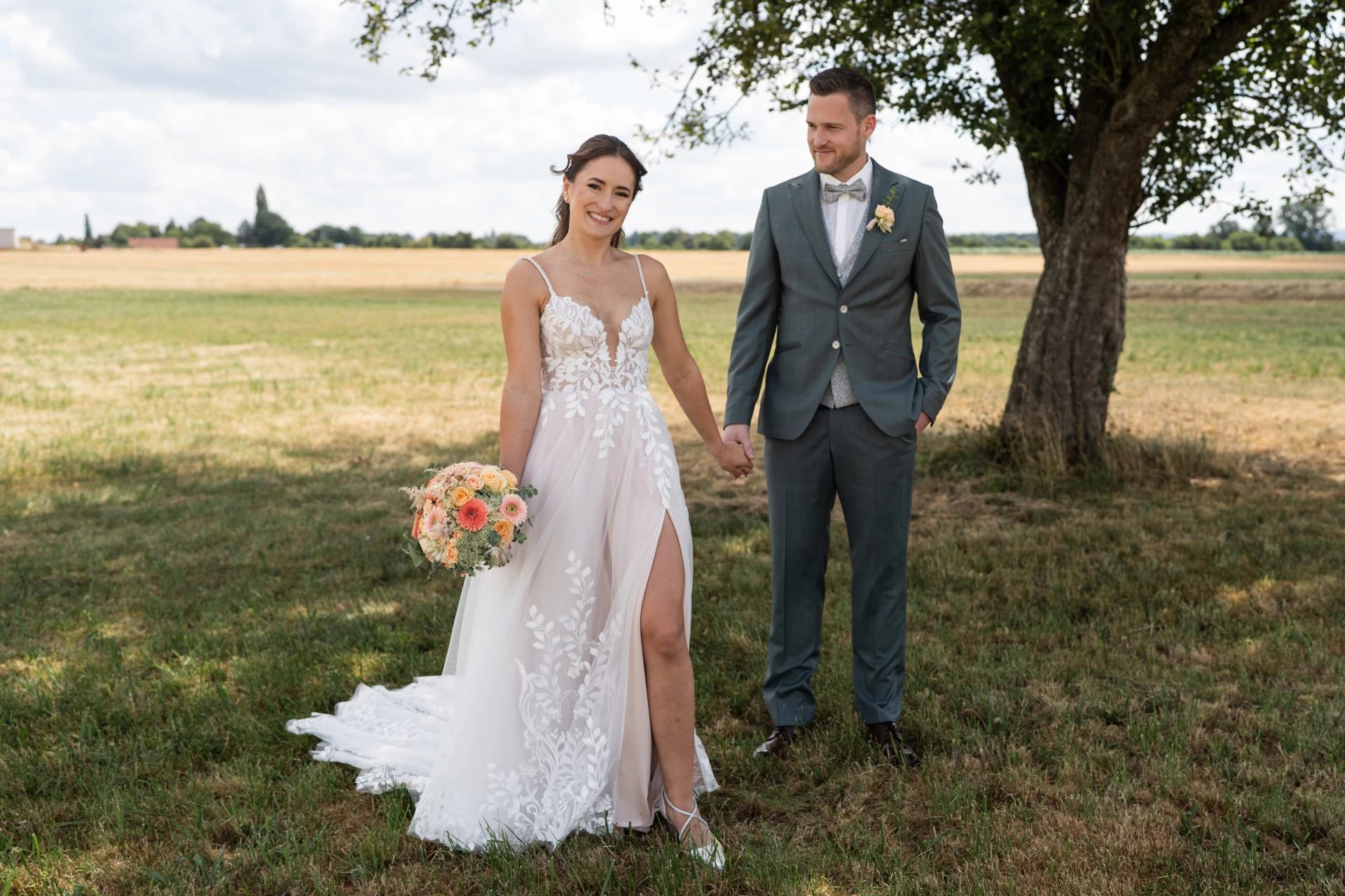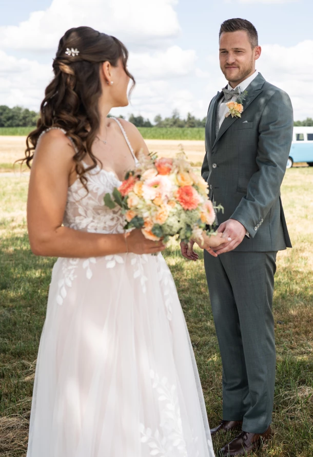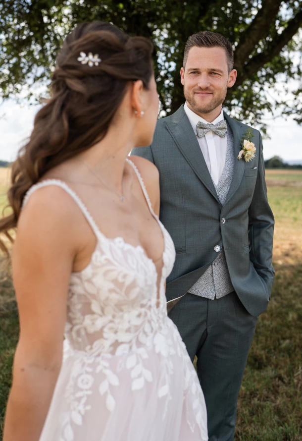 Der First Look bei dem sich Braut und Bräutigam das erste mal am Tag in ihrem Hochzeitsoutfit sehen war voller Glück, Liebe und strahlenden Augen. Beim gemeinsamen Brautpaarshooting konnte sich das Brautpaar ganz in Ruhe auf den bevorstehenden Tag freuen und in ruhiger Umgebung inmitten der Natur entstanden wunderschöne Bilder.