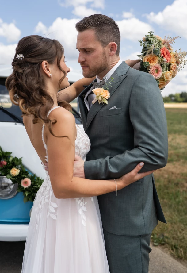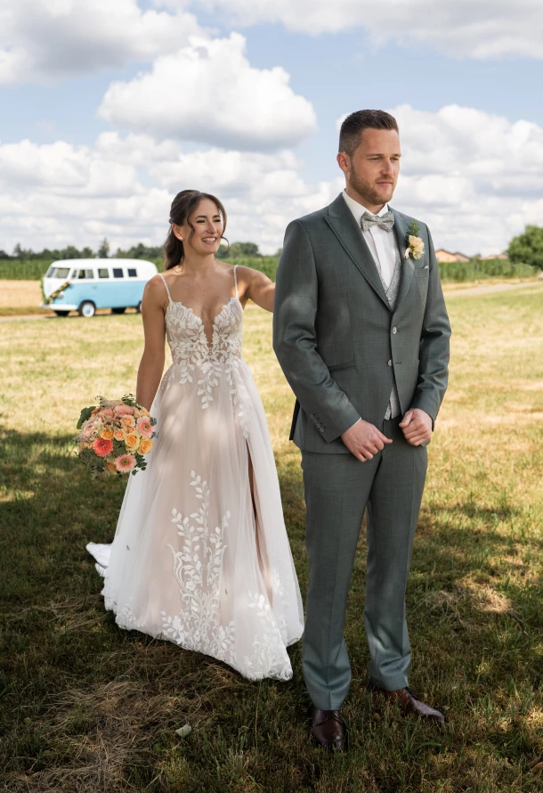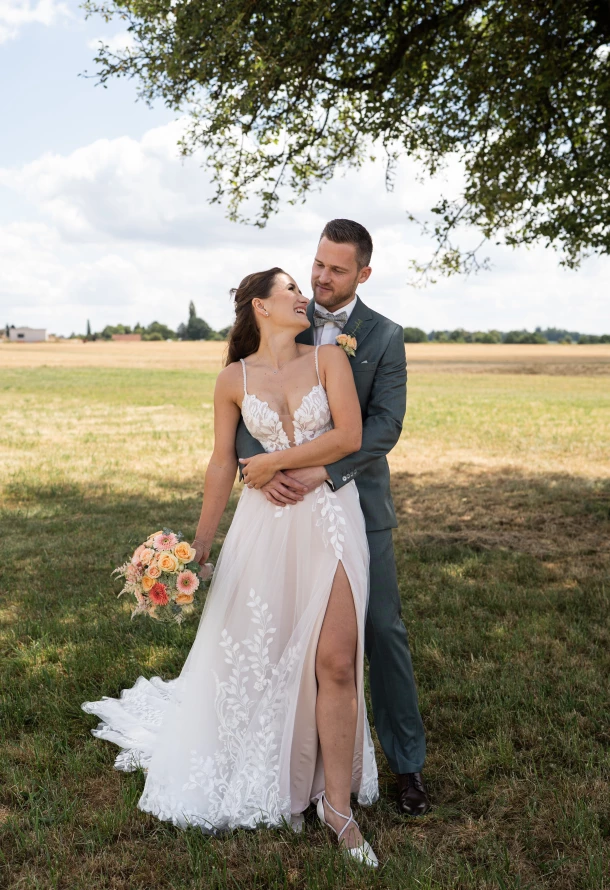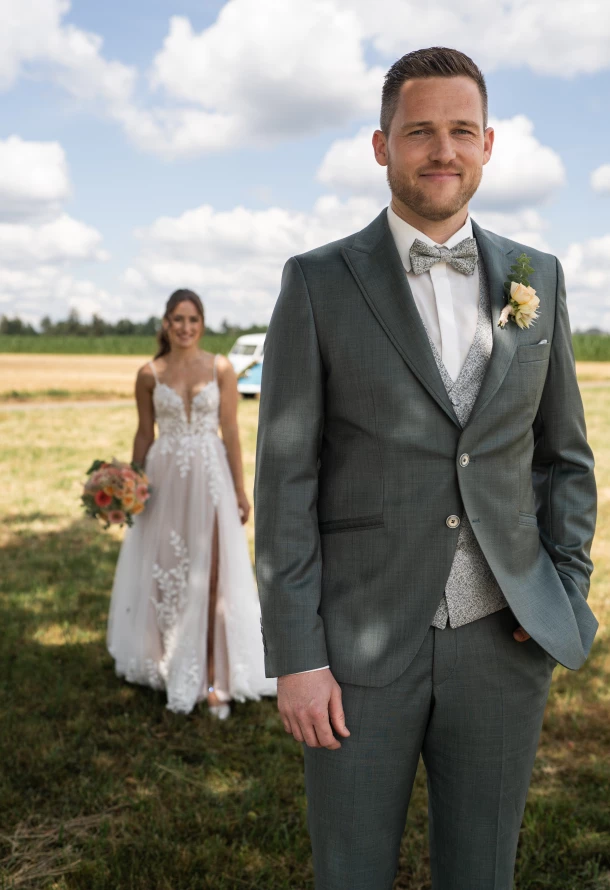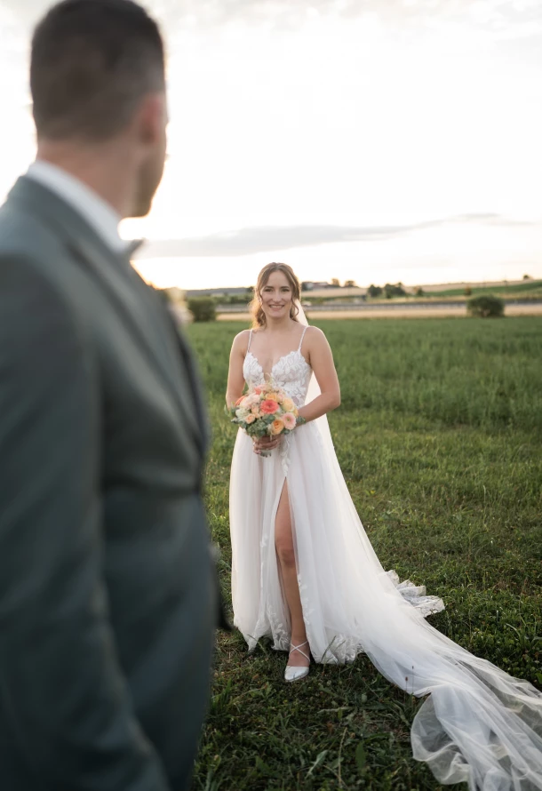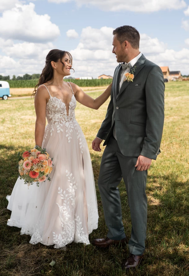 Der First Look bei dem sich Braut und Bräutigam das erste mal am Tag in ihrem Hochzeitsoutfit sehen war voller Glück, Liebe und strahlenden Augen. Beim gemeinsamen Brautpaarshooting konnte sich das Brautpaar ganz in Ruhe auf den bevorstehenden Tag freuen und in ruhiger Umgebung inmitten der Natur entstanden wunderschöne Bilder.