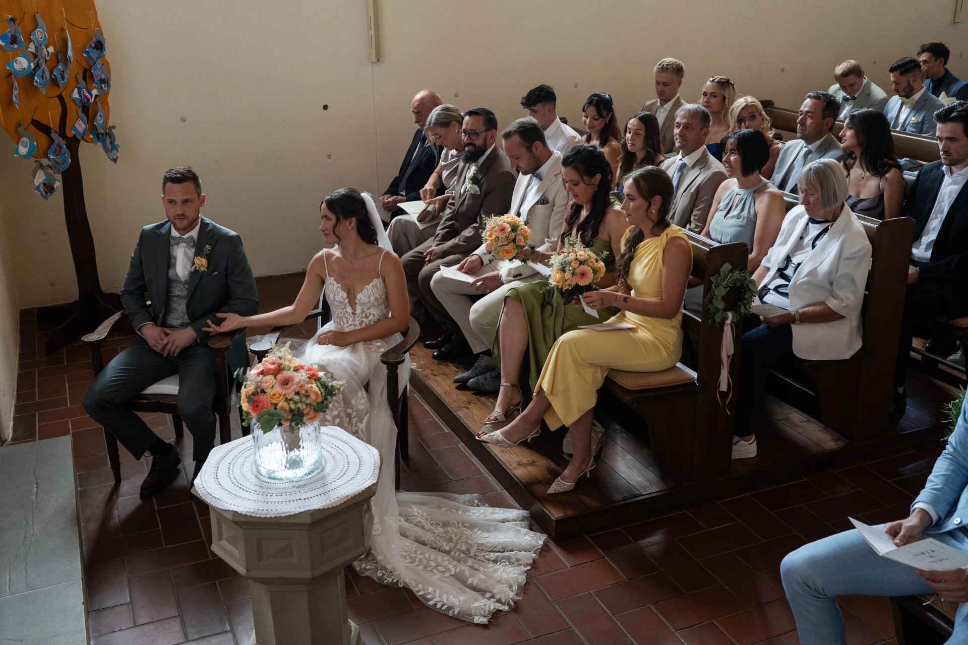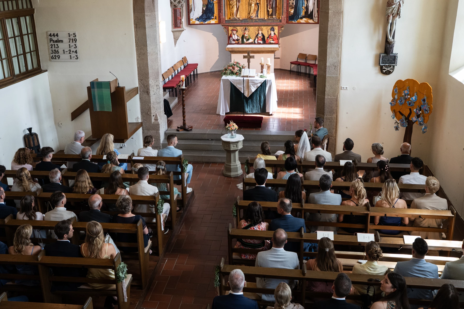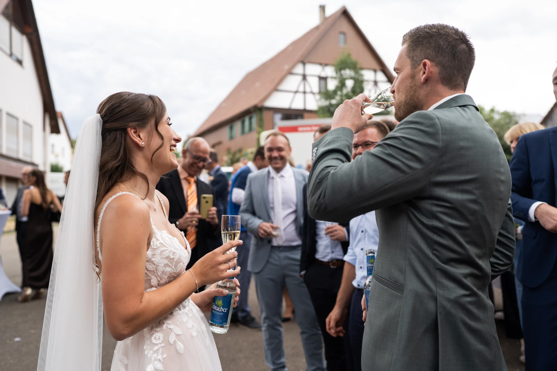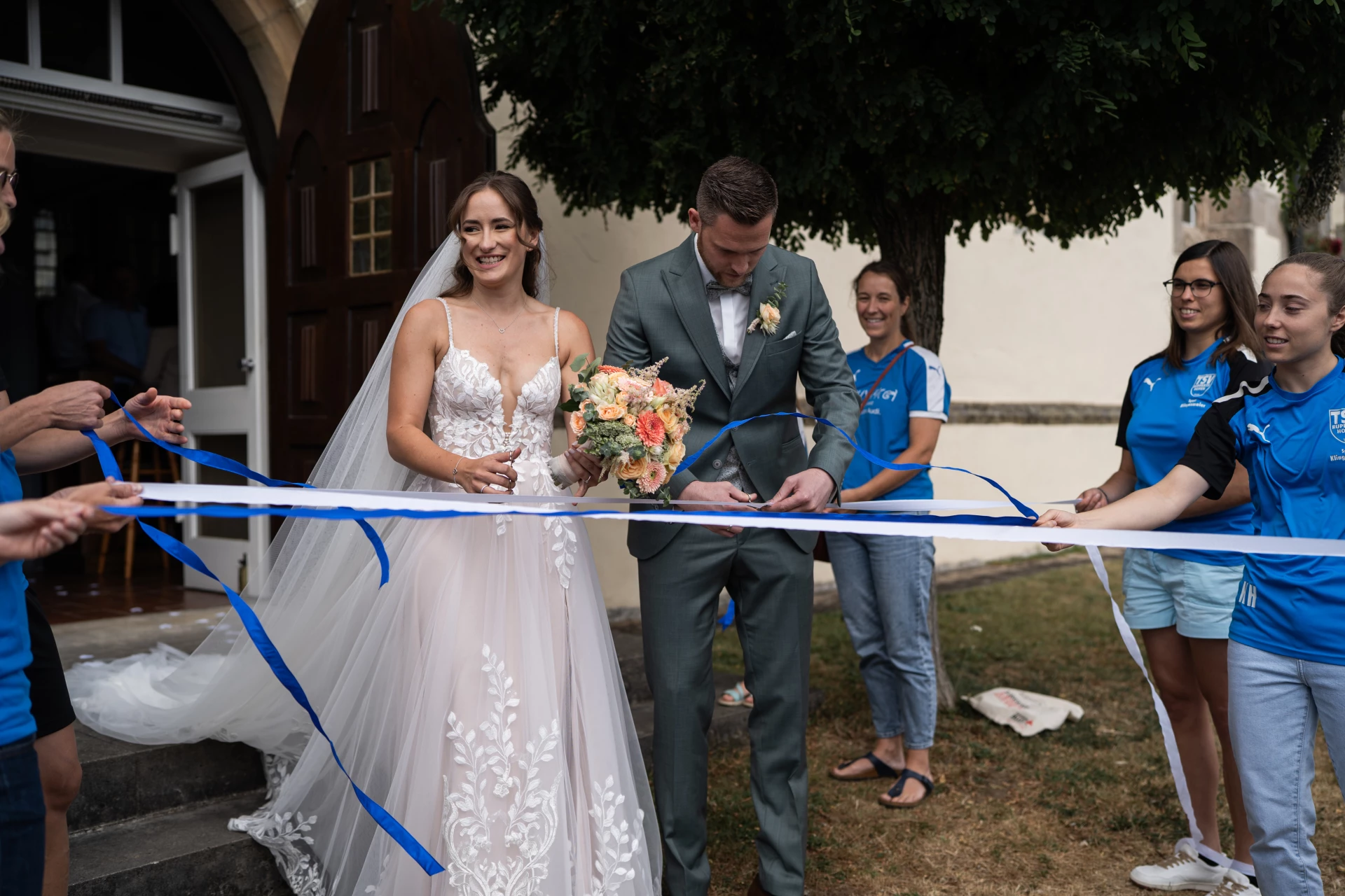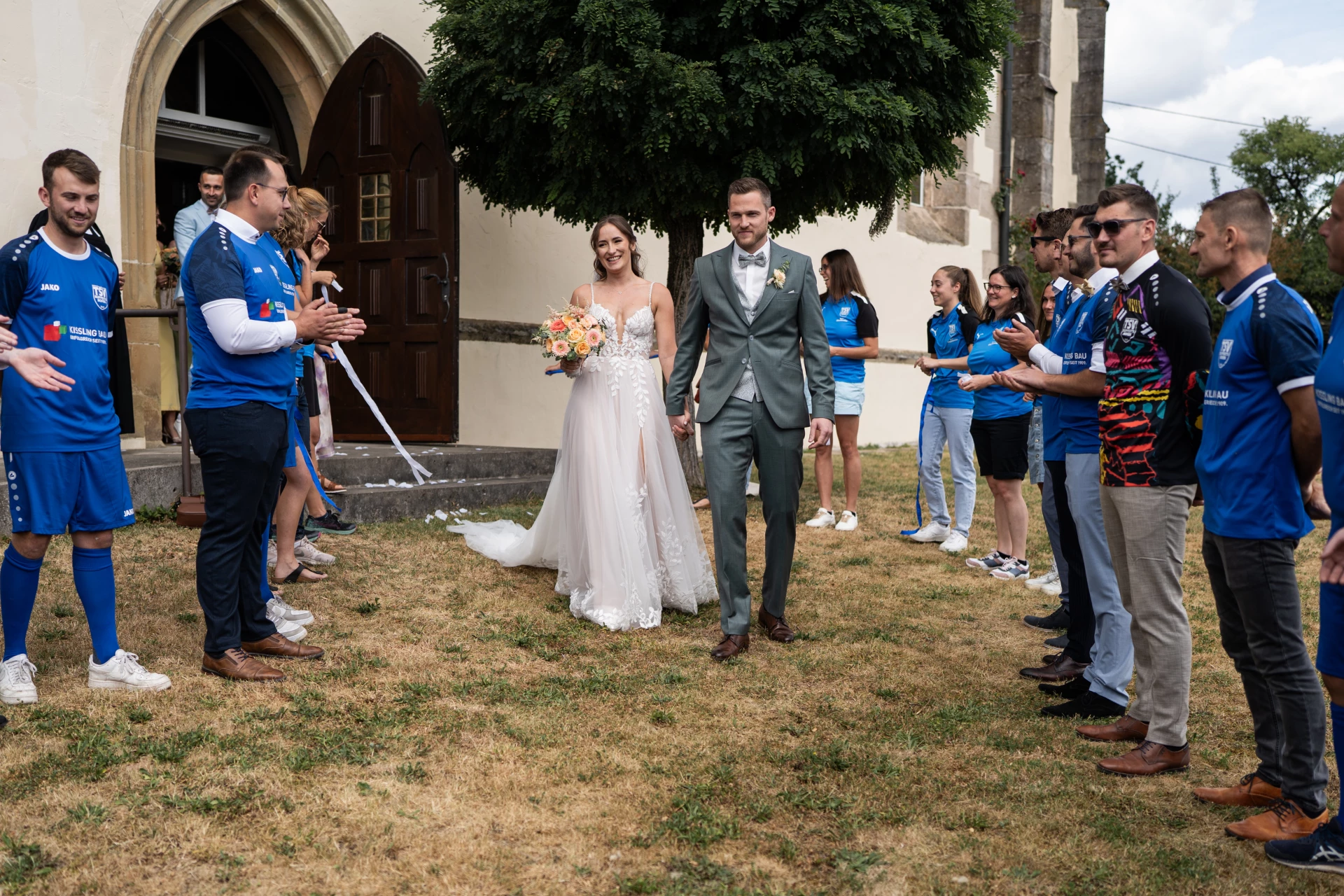 Danach gaben sich Amelie & Marc in der Kirche in Eschach ihr Ja-Wort, wo sie danach bei einem fröhlichen Sektempfang von all ihren Gästen beglückwünscht wurden.