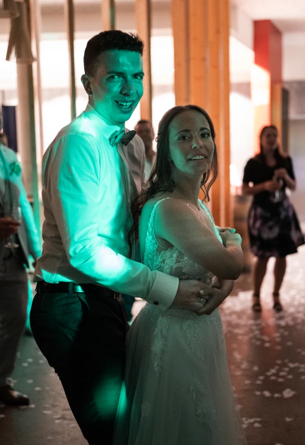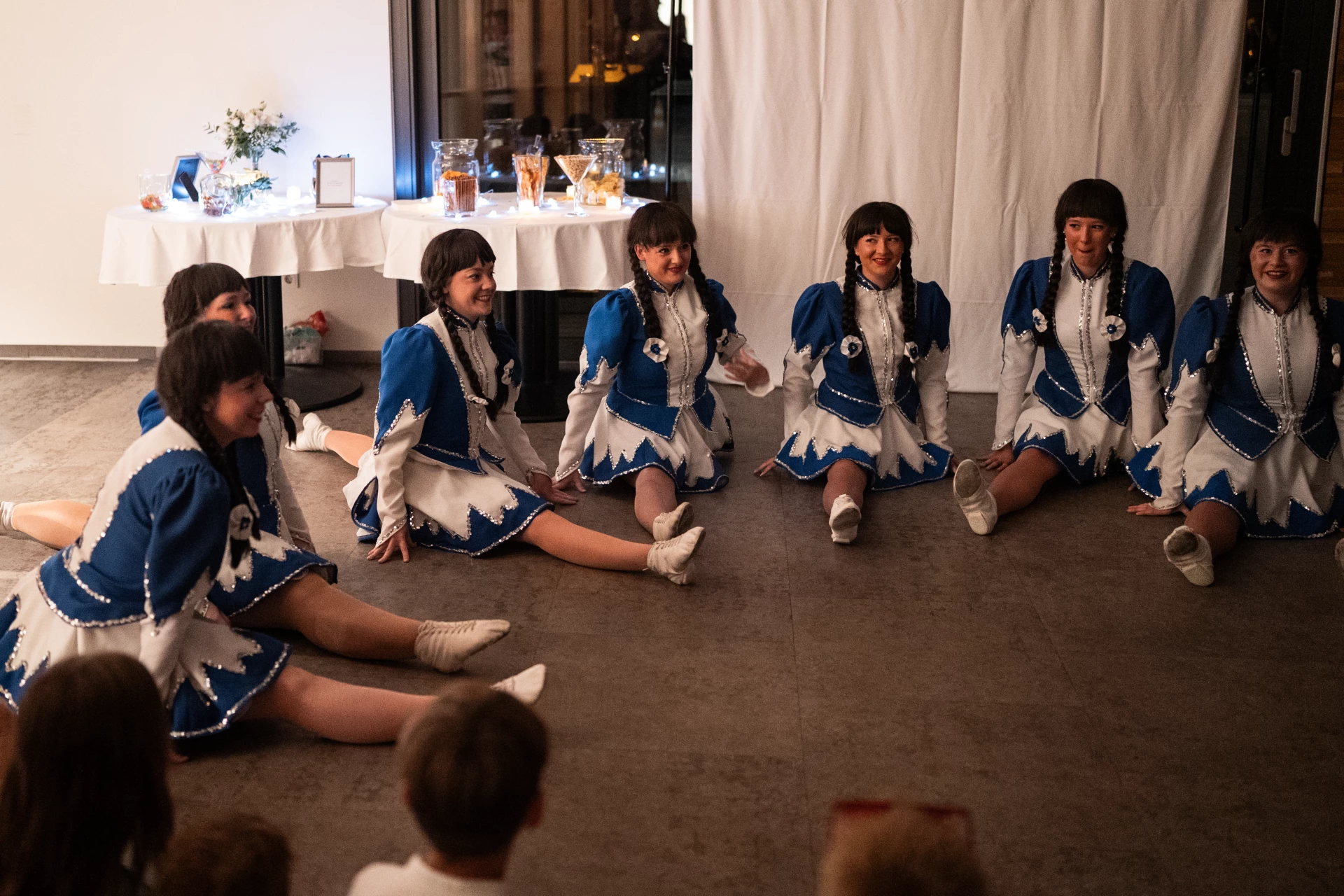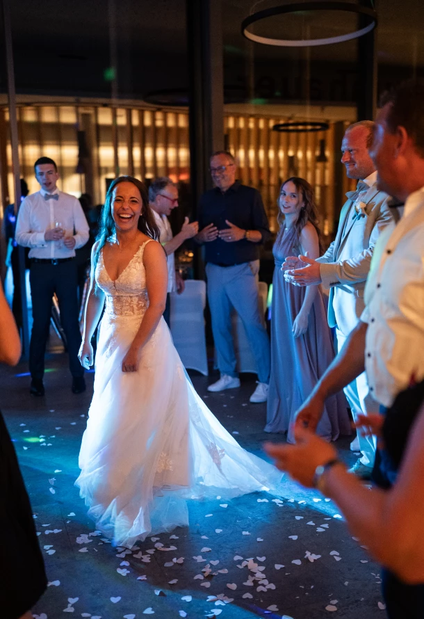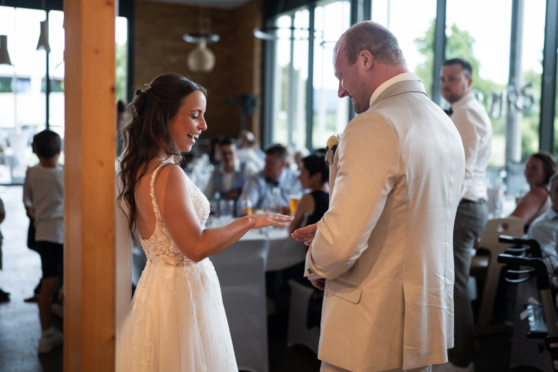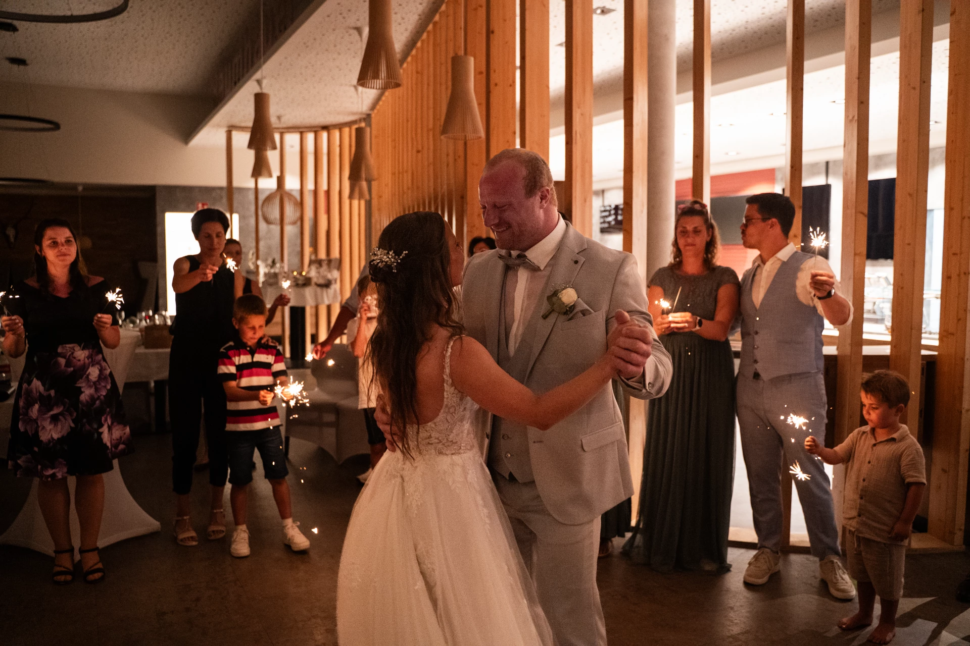 Das Brautpaar hatte die Location mit viel Liebe zum Detail dekoriert, sodass eine wunderschöne Atmosphäre entstand. Die Gäste wurden mit einem köstlichen Essen verwöhnt und mit dem ein oder anderen Kaltgetränk wurde die Stimmung immer gelassener. Das Brautpaar eröffnete die Tanzfläche mit einem klassischen Brautwalzer und als Überraschung des Abends kamen die Gardemädels der Braut noch für einen Auftritt vorbei. Die Stimmung war ausgelassen und fröhlich und das Brautpaar ließ sich sichtlich feiern.