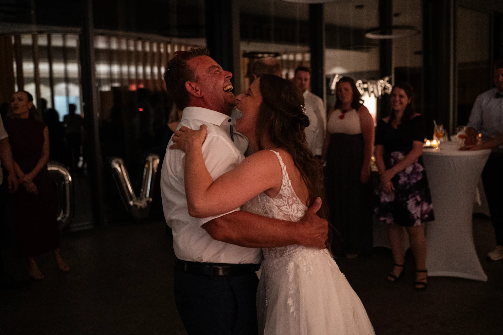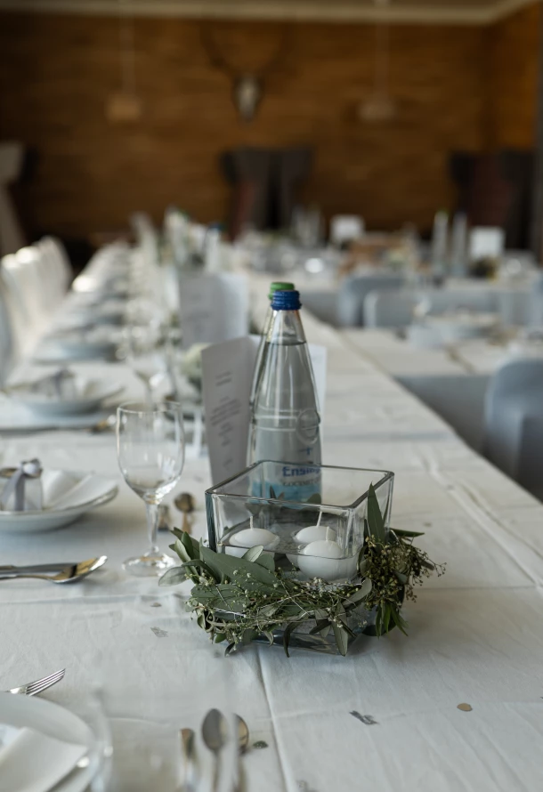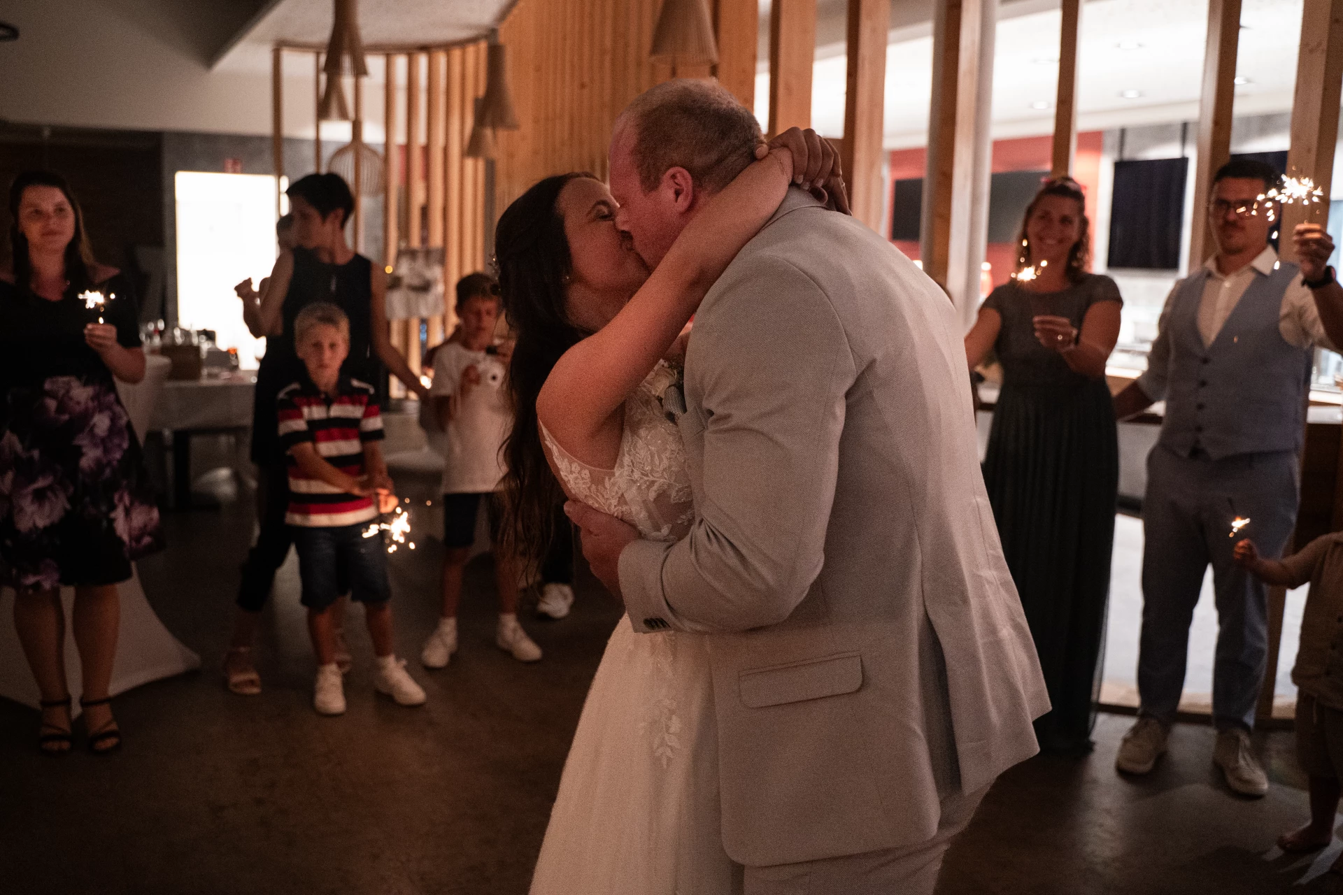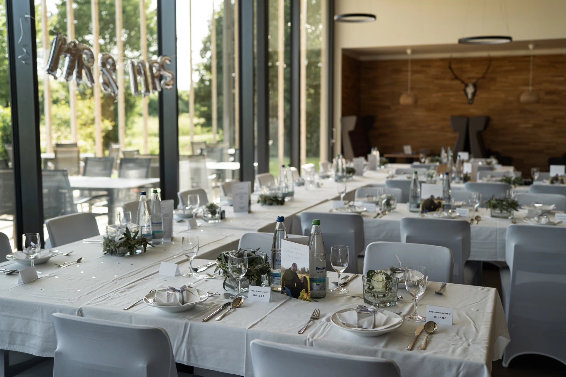 Das Brautpaar hatte die Location mit viel Liebe zum Detail dekoriert, sodass eine wunderschöne Atmosphäre entstand. Die Gäste wurden mit einem köstlichen Essen verwöhnt und mit dem ein oder anderen Kaltgetränk wurde die Stimmung immer gelassener. Das Brautpaar eröffnete die Tanzfläche mit einem klassischen Brautwalzer und als Überraschung des Abends kamen die Gardemädels der Braut noch für einen Auftritt vorbei. Die Stimmung war ausgelassen und fröhlich und das Brautpaar ließ sich sichtlich feiern.