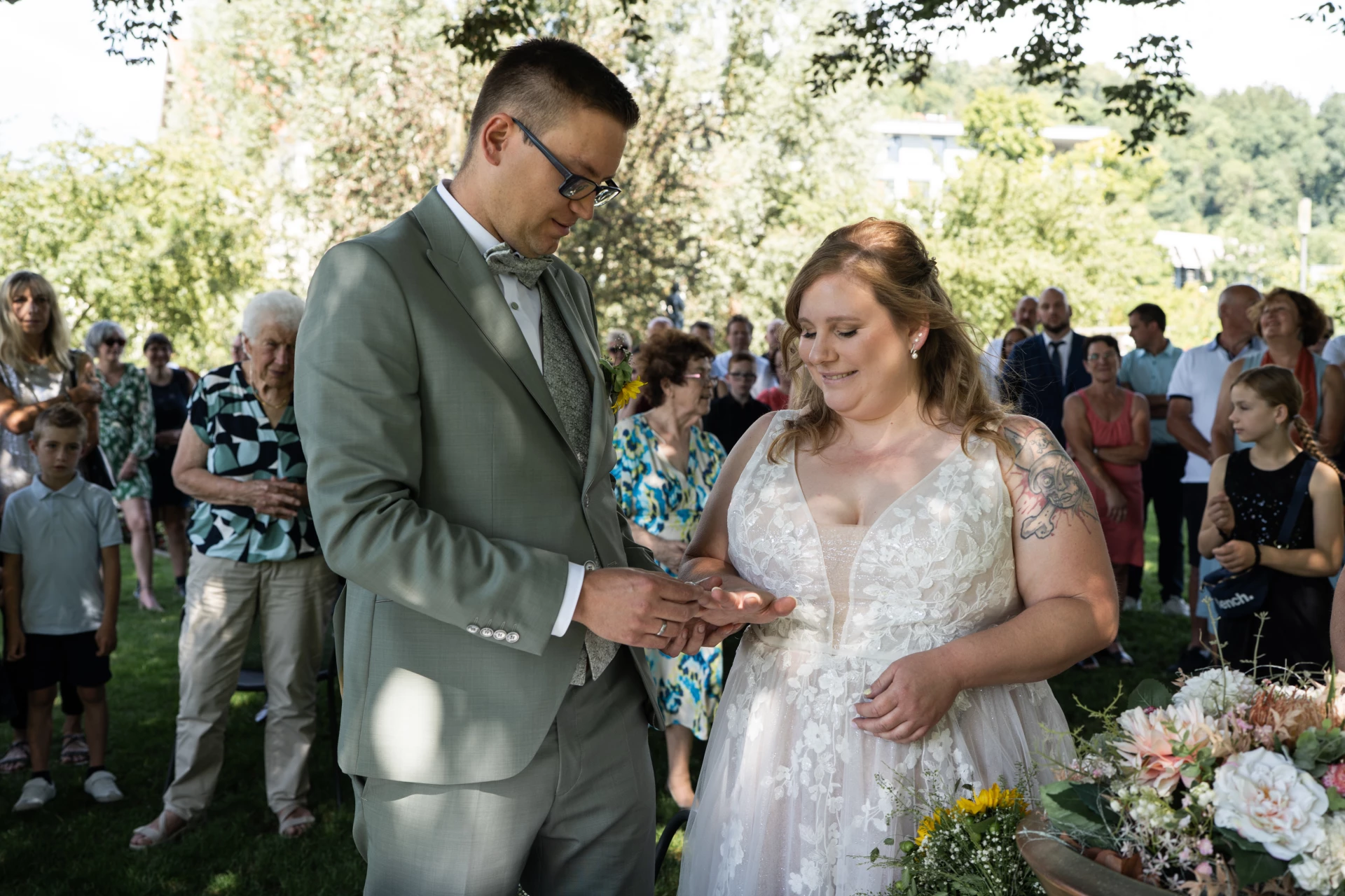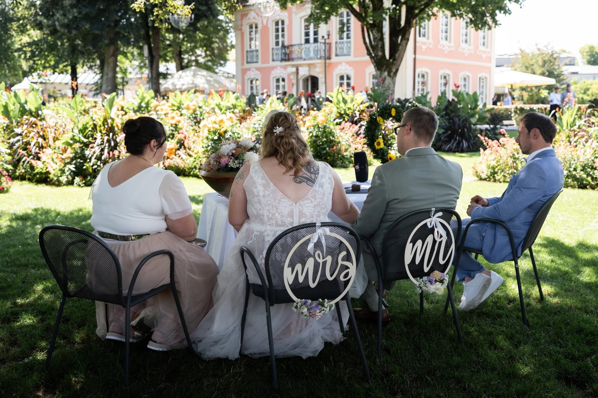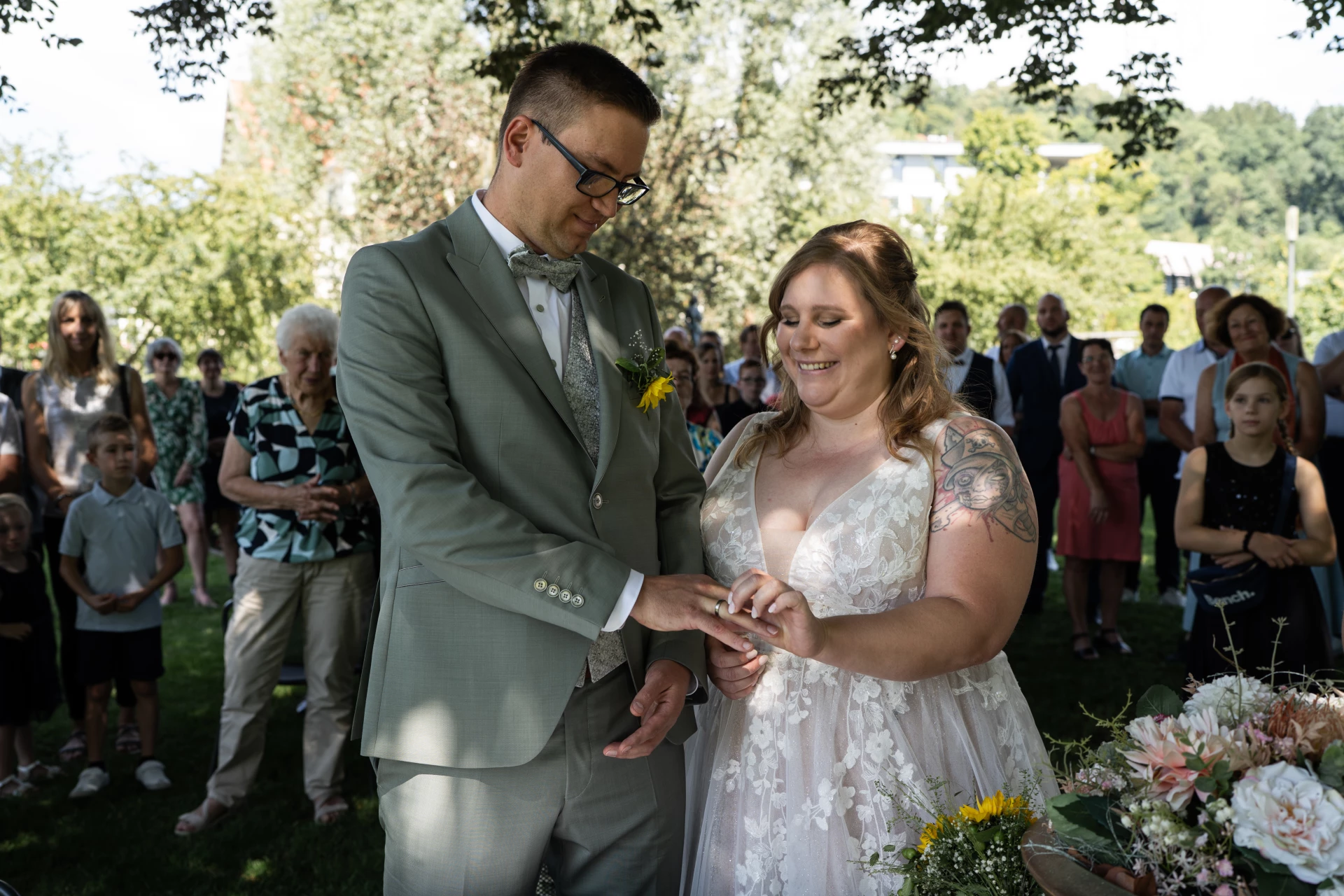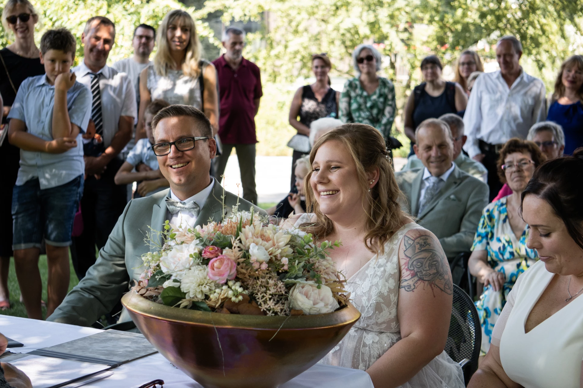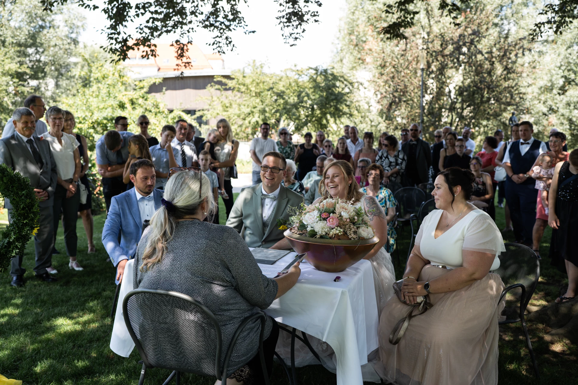 Die anschließende Trauung fand im freien Trauzimmer in Schwäbisch Gmünd im Grünen mit Blick auf das Rokokoschlösschen statt. Die freie Trauung war emotional, es wurde gelacht und die Freude war bei allen Gästen sichtlich spürbar. Die Gratulationen für das Brautpaar im Anschluss waren liebevoll und herzerwärmend. Beim gemeinsamen Sektempfang wurde mit Familie und Freunde auf das Brautpaar angestoßen.