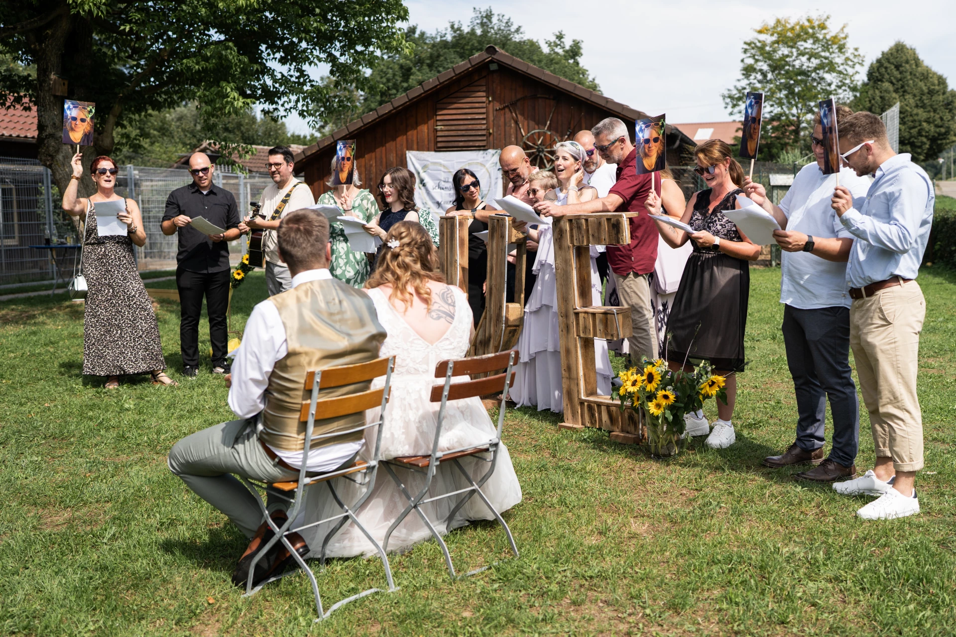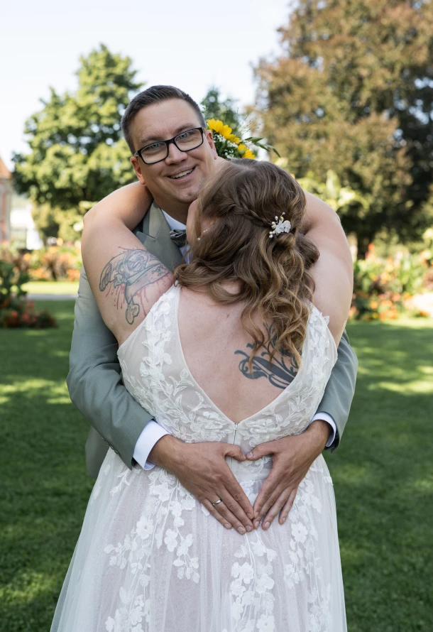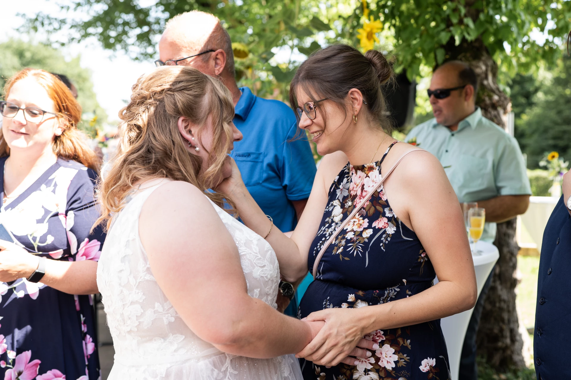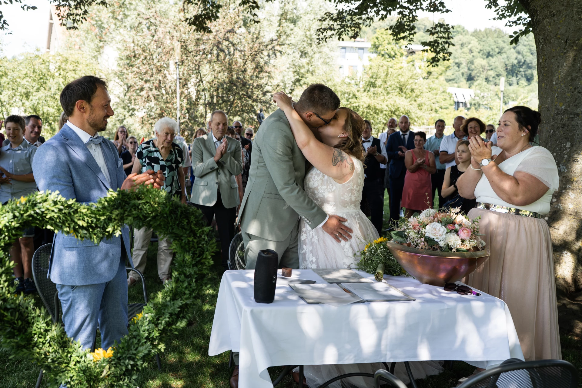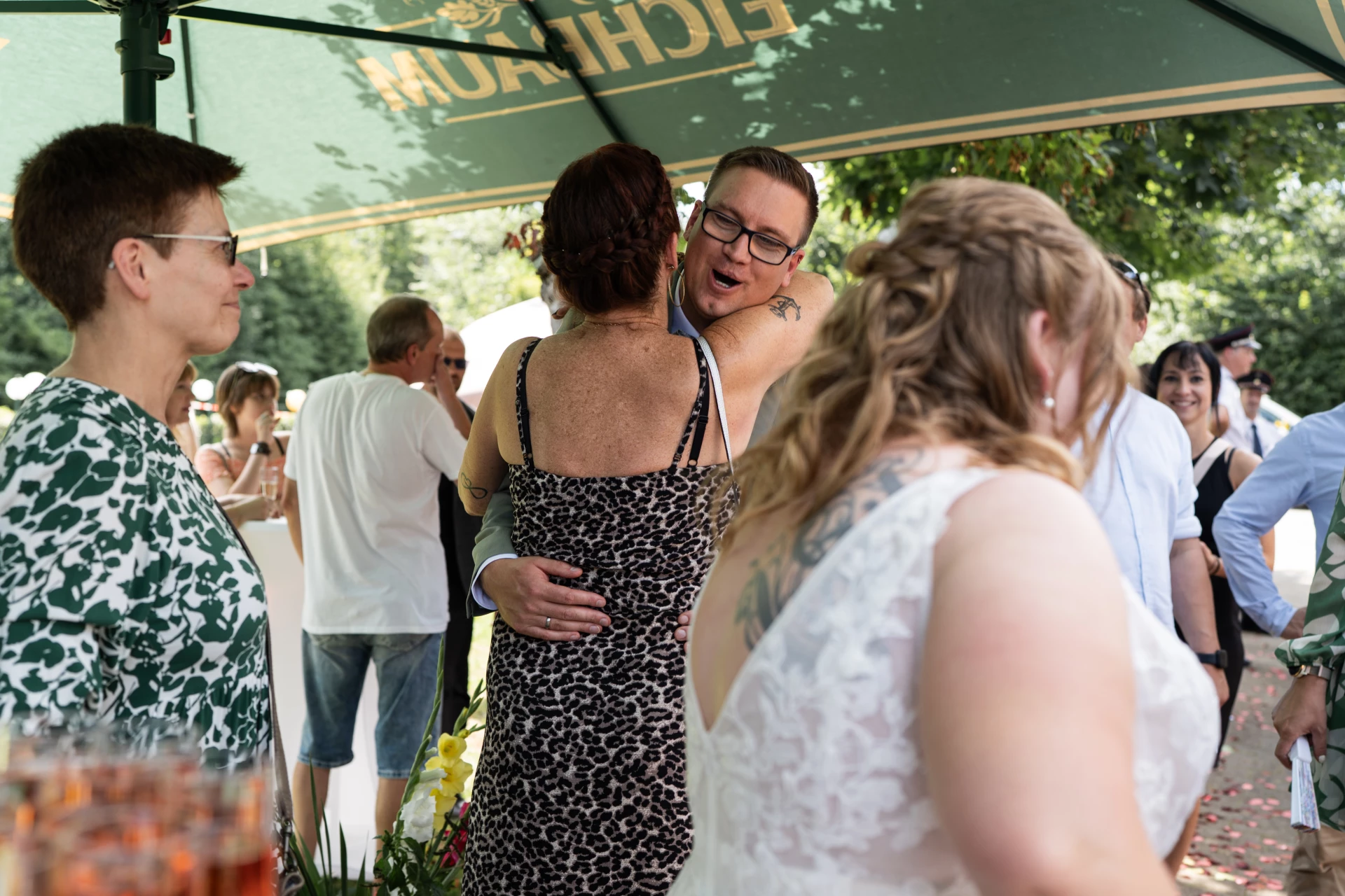 Die anschließende Trauung fand im freien Trauzimmer in Schwäbisch Gmünd im Grünen mit Blick auf das Rokokoschlösschen statt. Die freie Trauung war emotional, es wurde gelacht und die Freude war bei allen Gästen sichtlich spürbar. Die Gratulationen für das Brautpaar im Anschluss waren liebevoll und herzerwärmend. Beim gemeinsamen Sektempfang wurde mit Familie und Freunde auf das Brautpaar angestoßen.