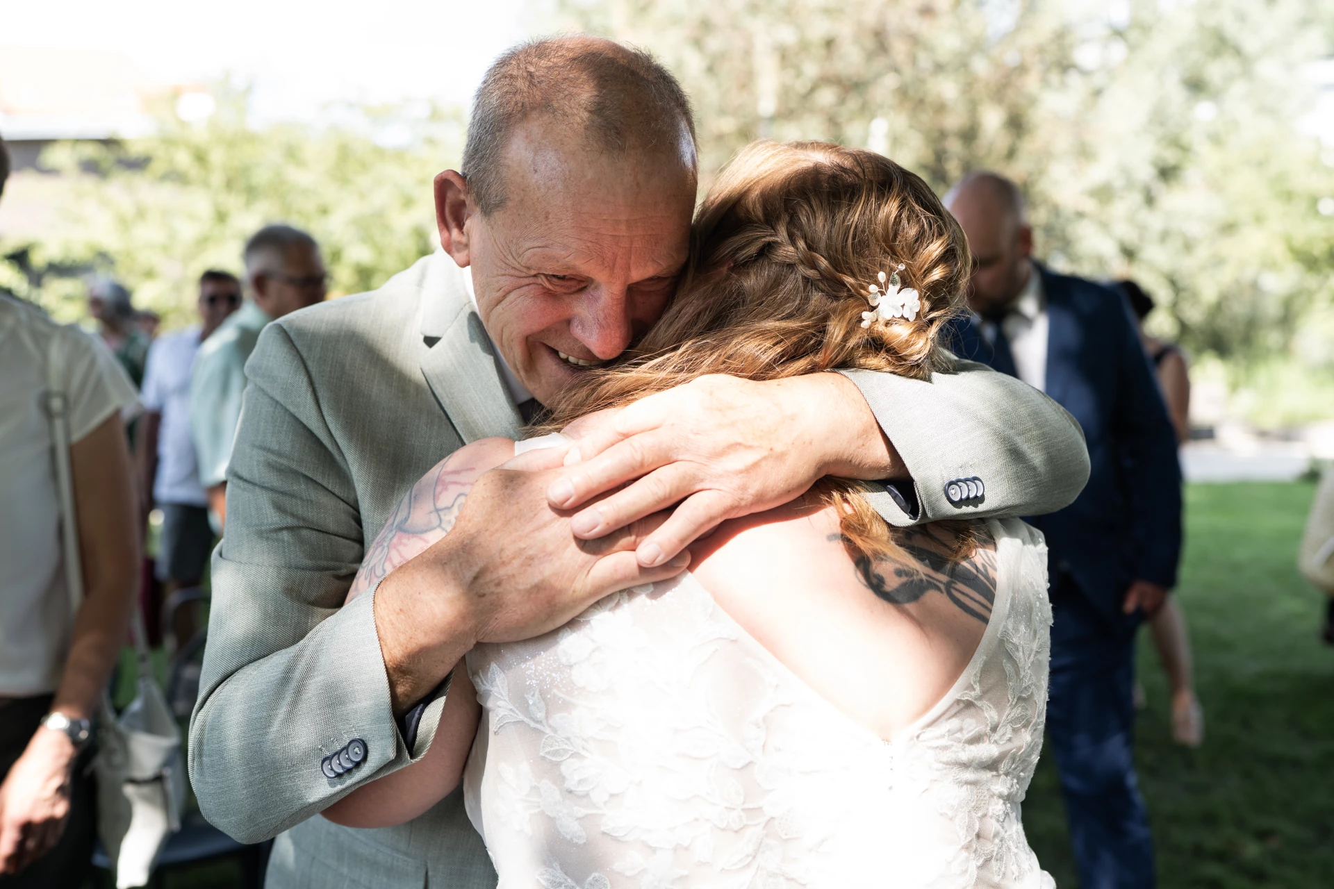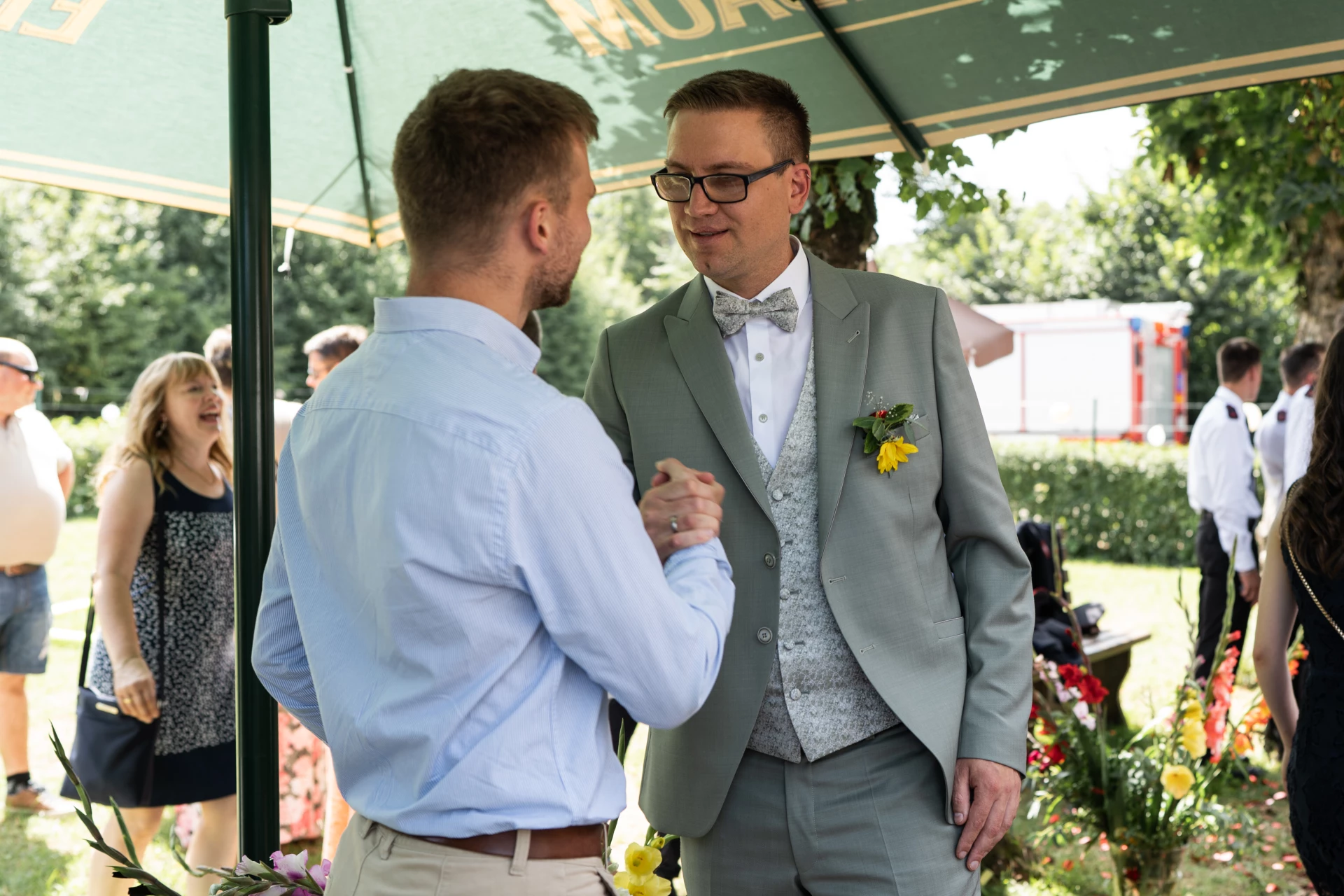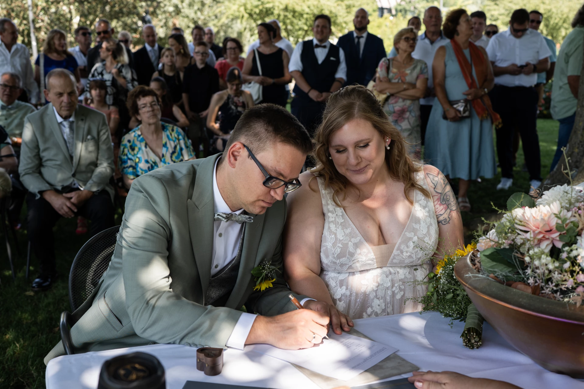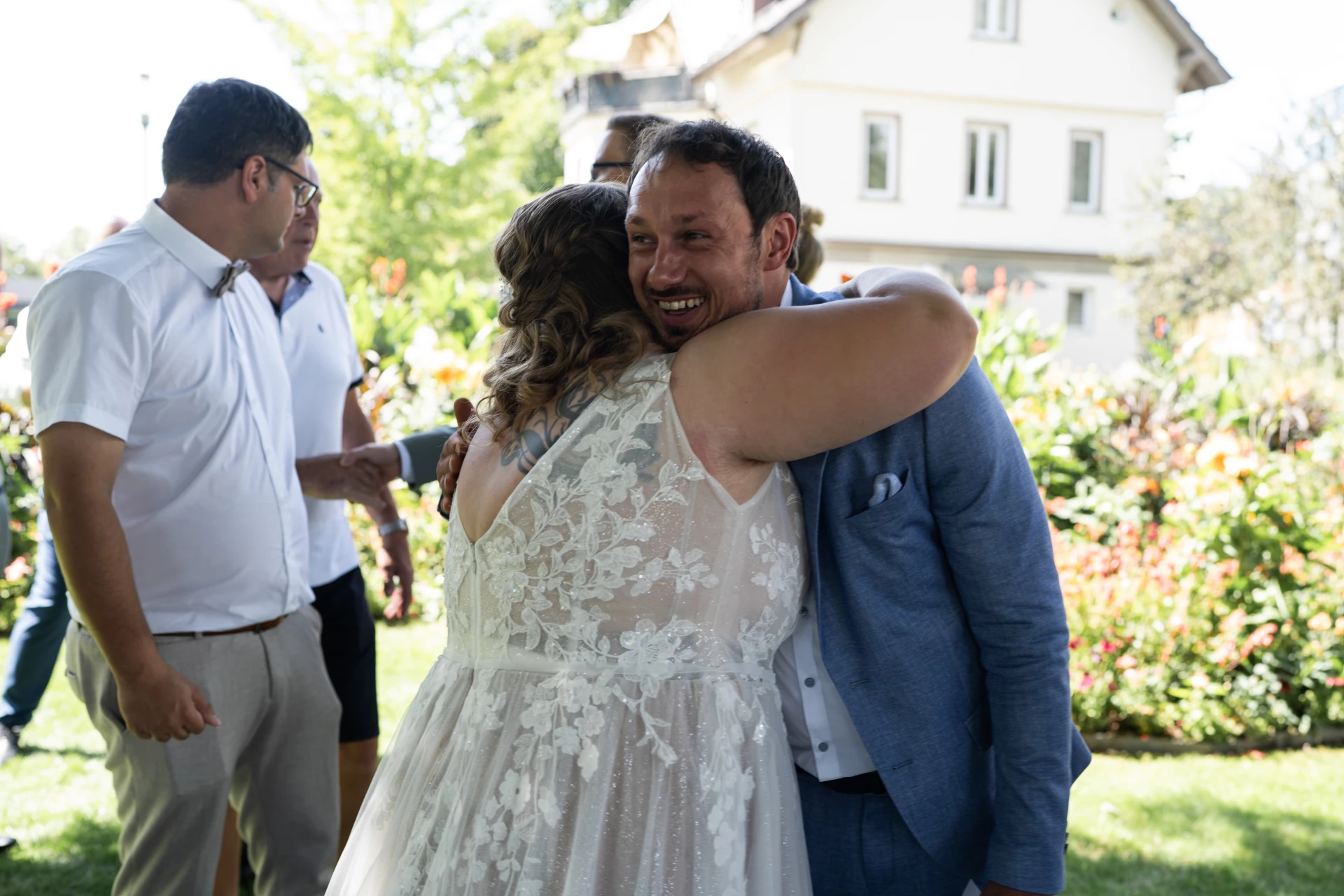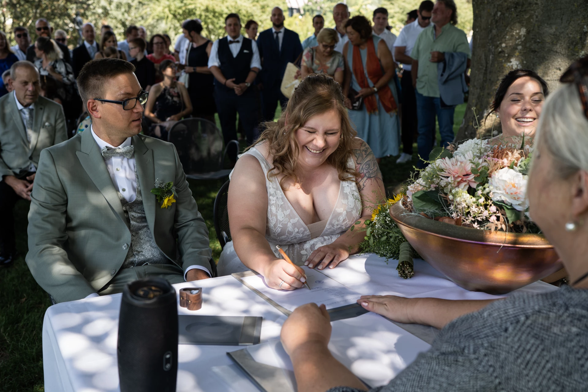 Die anschließende Trauung fand im freien Trauzimmer in Schwäbisch Gmünd im Grünen mit Blick auf das Rokokoschlösschen statt. Die freie Trauung war emotional, es wurde gelacht und die Freude war bei allen Gästen sichtlich spürbar. Die Gratulationen für das Brautpaar im Anschluss waren liebevoll und herzerwärmend. Beim gemeinsamen Sektempfang wurde mit Familie und Freunde auf das Brautpaar angestoßen.