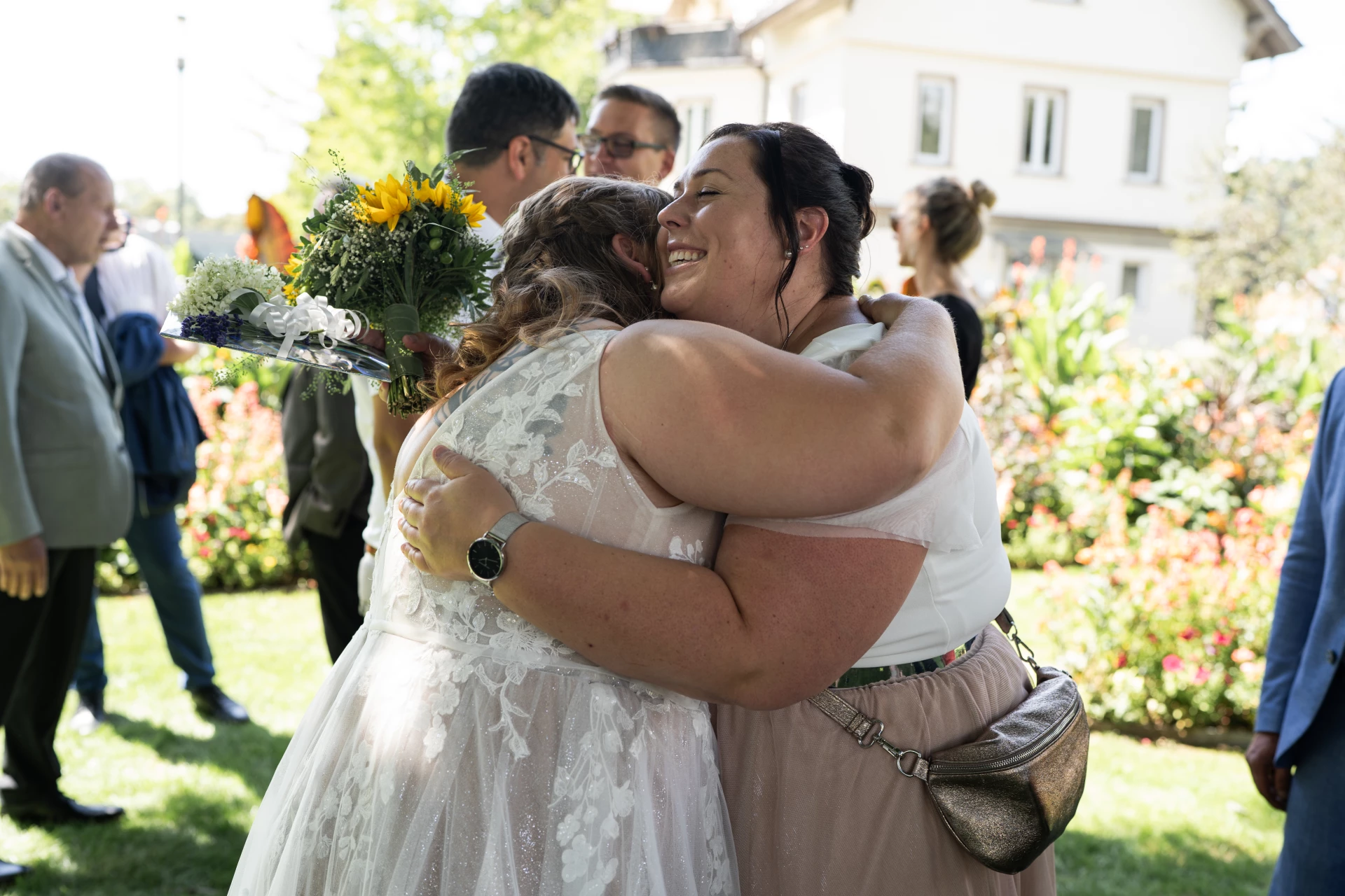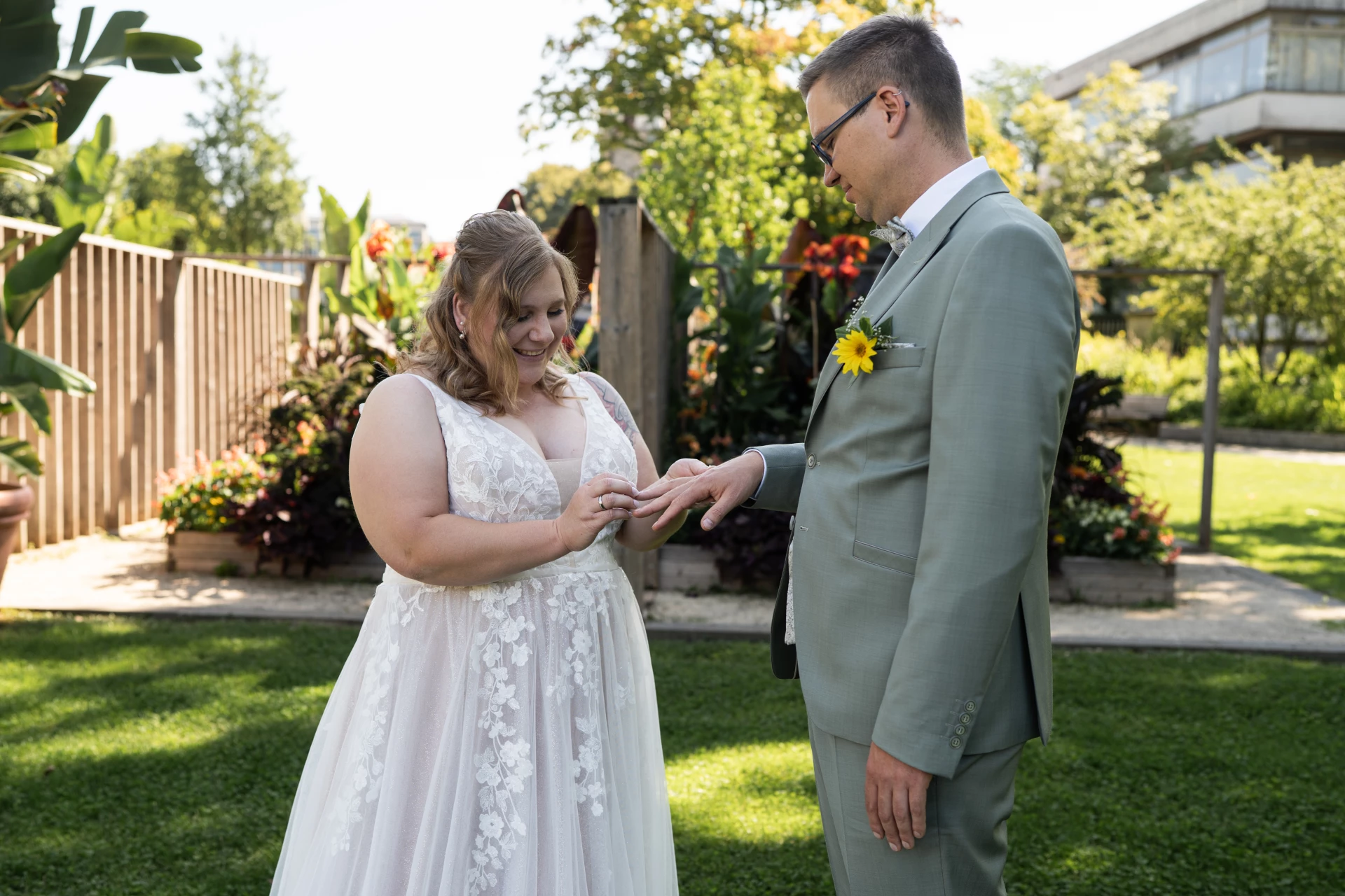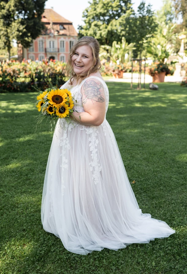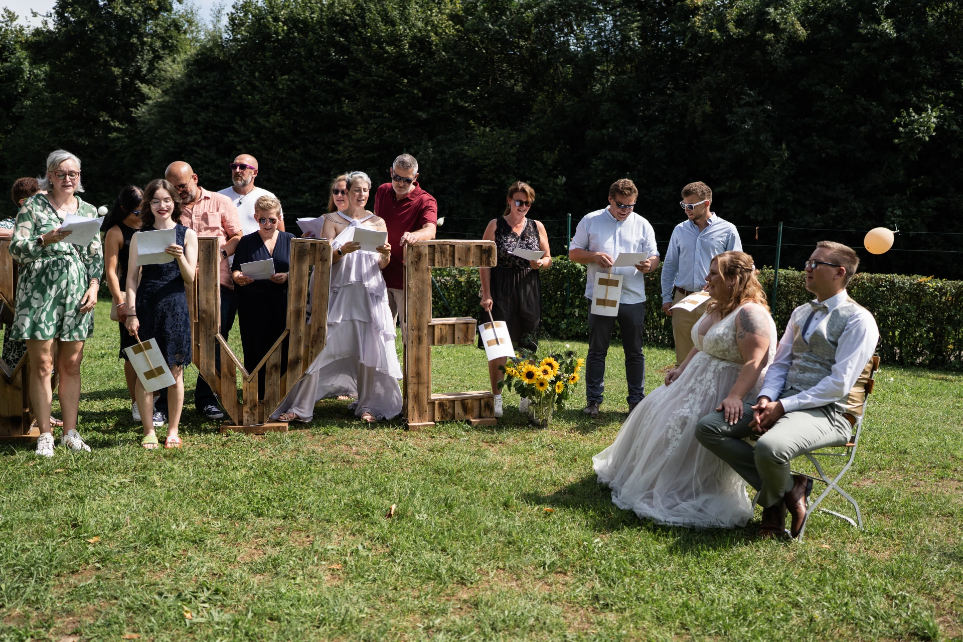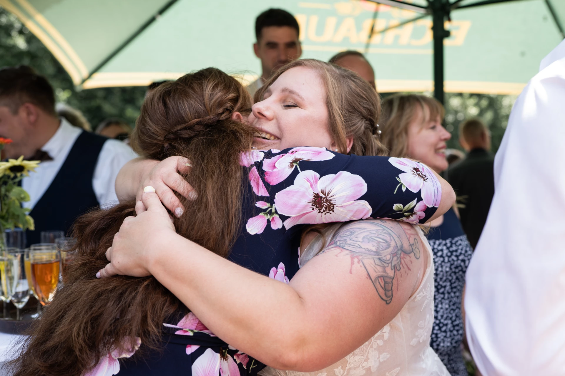Die anschließende Trauung fand im freien Trauzimmer in Schwäbisch Gmünd im Grünen mit Blick auf das Rokokoschlösschen statt. Die freie Trauung war emotional, es wurde gelacht und die Freude war bei allen Gästen sichtlich spürbar. Die Gratulationen für das Brautpaar im Anschluss waren liebevoll und herzerwärmend. Beim gemeinsamen Sektempfang wurde mit Familie und Freunde auf das Brautpaar angestoßen.