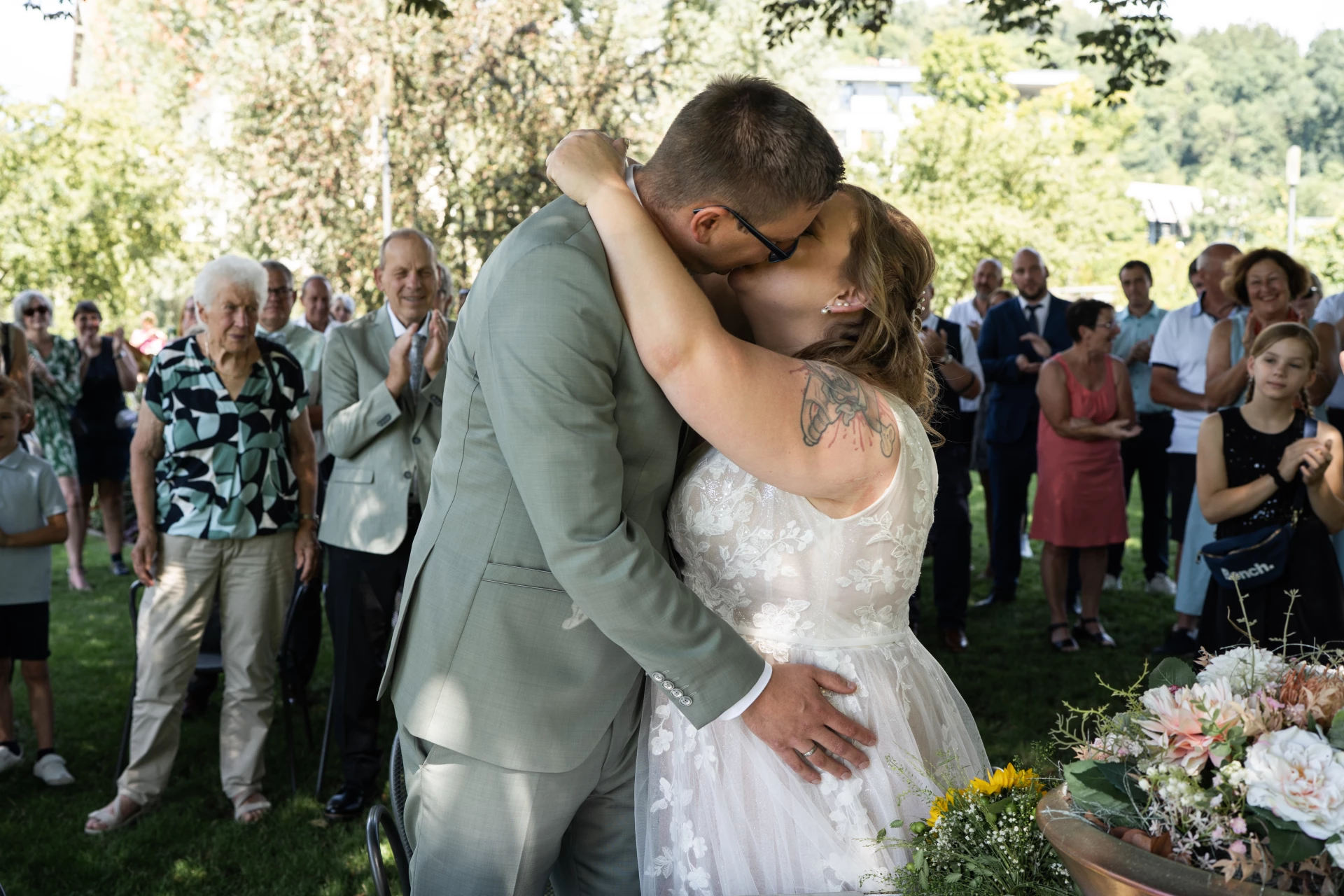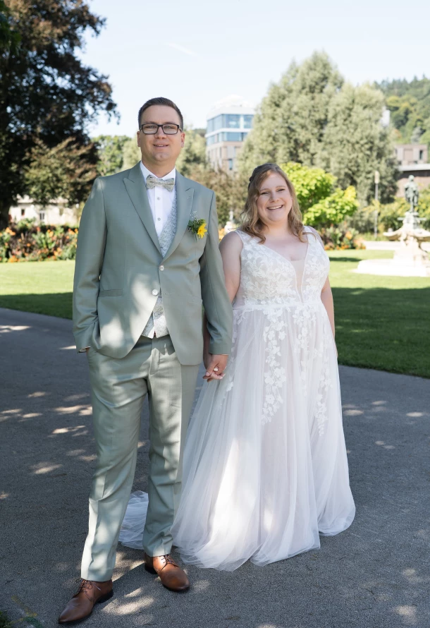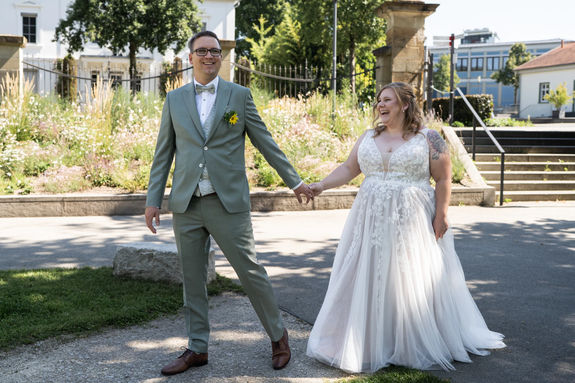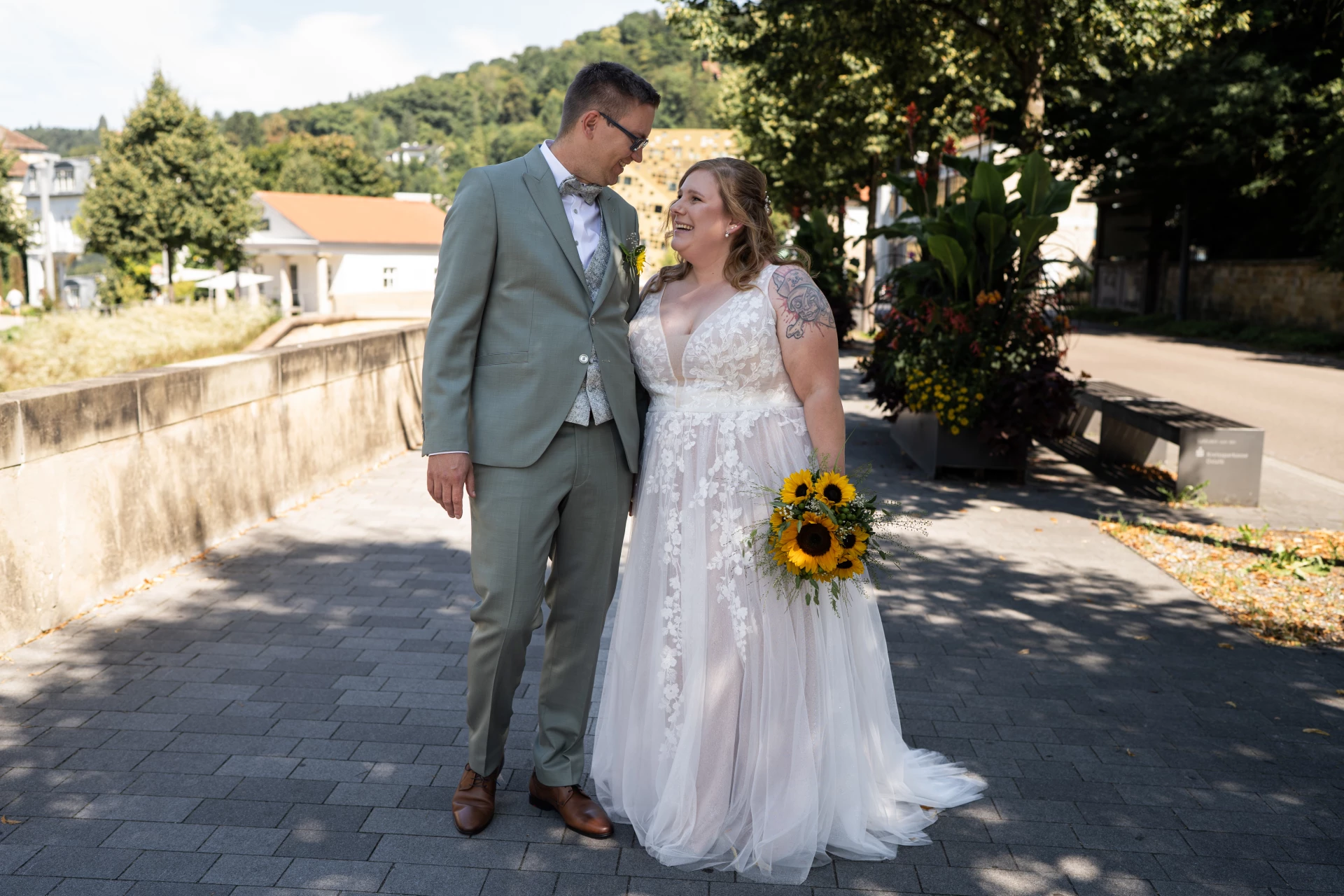 Im Anschluss an den First Look nutzen wir das traumhafte Sommerwetter um Brautpaarbilder im Stadtgarten und am Josefsbach einzufangen. Die grüne Umgebung, blühende Blumen und historische Bauwerke im Hintergrund waren eine perfekte Kulisse für wunderschöne Hochzeitsbilder.