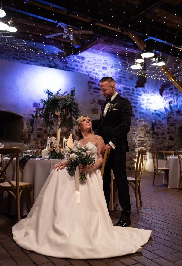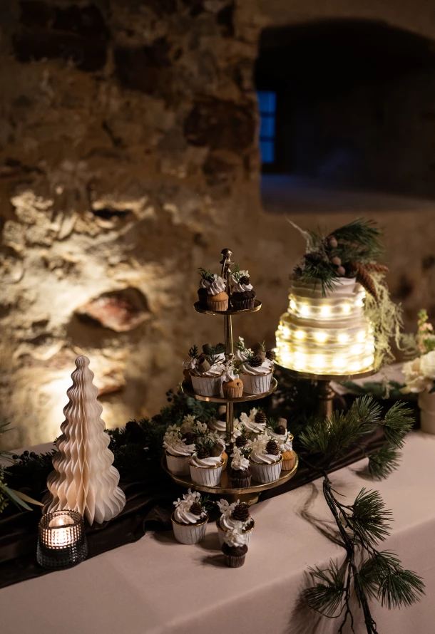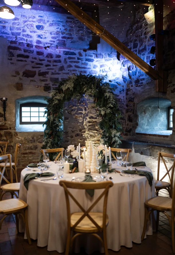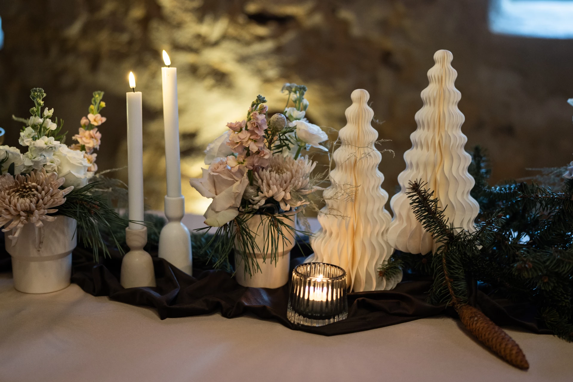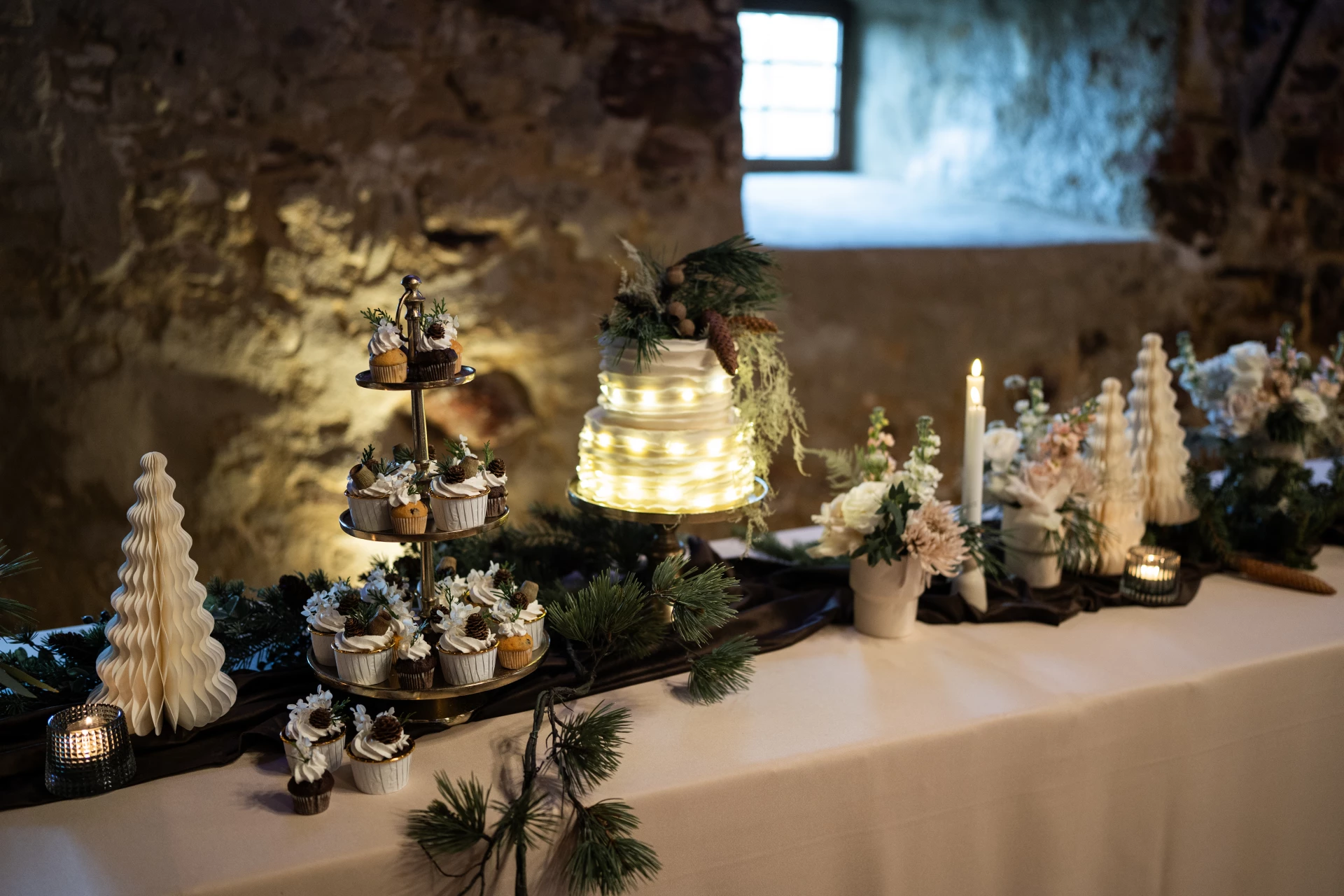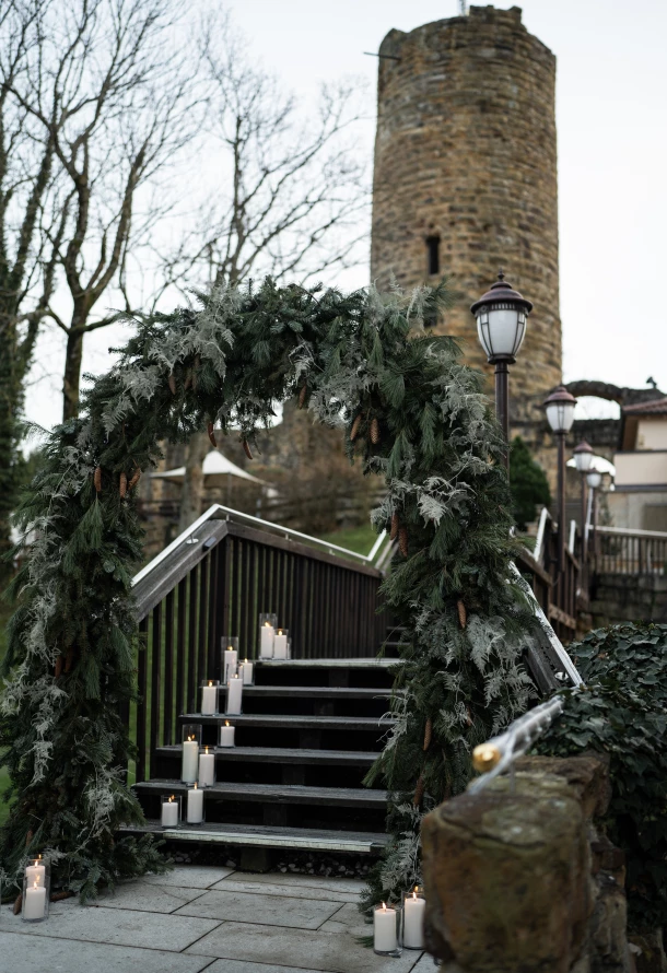 Bereits beim betreten der Location lag ein Zauber in der Luft. Die winterliche Dekoration mit Kerzen, Tannenzweigen und stilvollen Akzenten schuf eine festliche und zugleich gemütliche Atmosphäre, die perfekt zur Jahreszeit passte. Mit einem traumhaften Blick auf den Burgturm fand die freie Trauung unter freiem Himmel statt. Die Feier fand in der winterlich dekorierten Burgscheune statt.