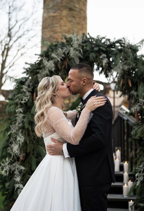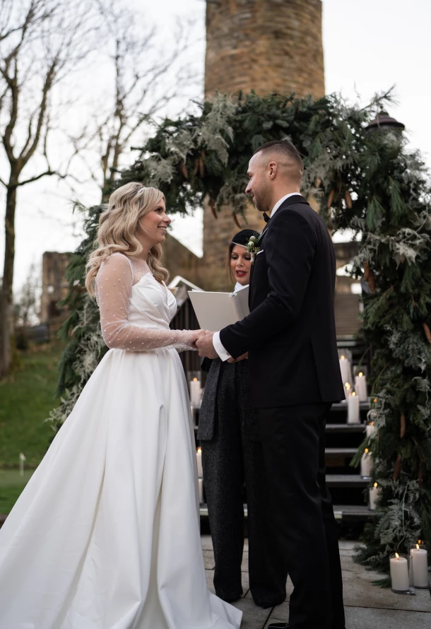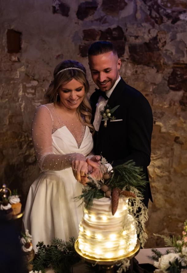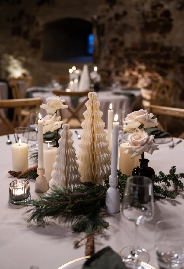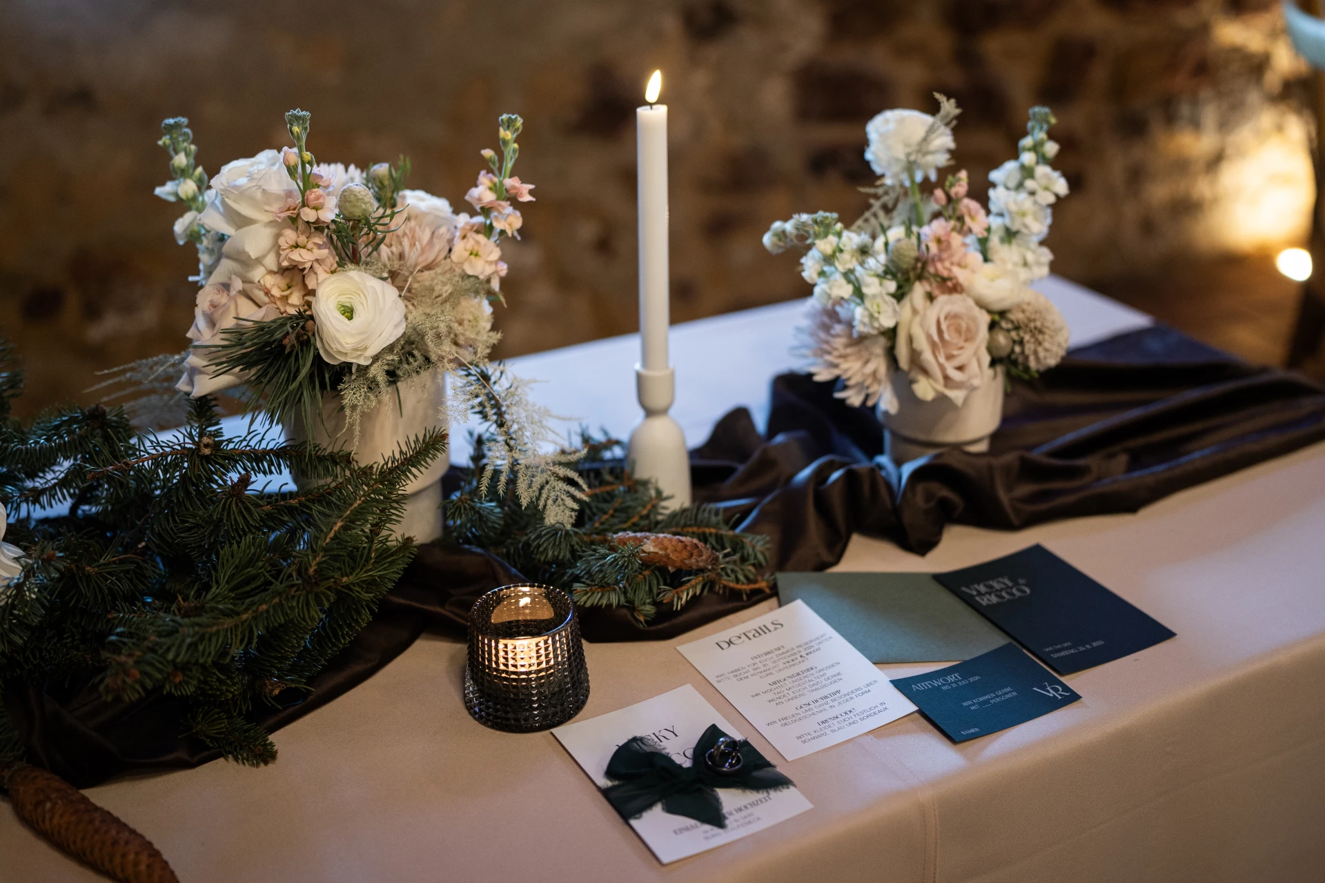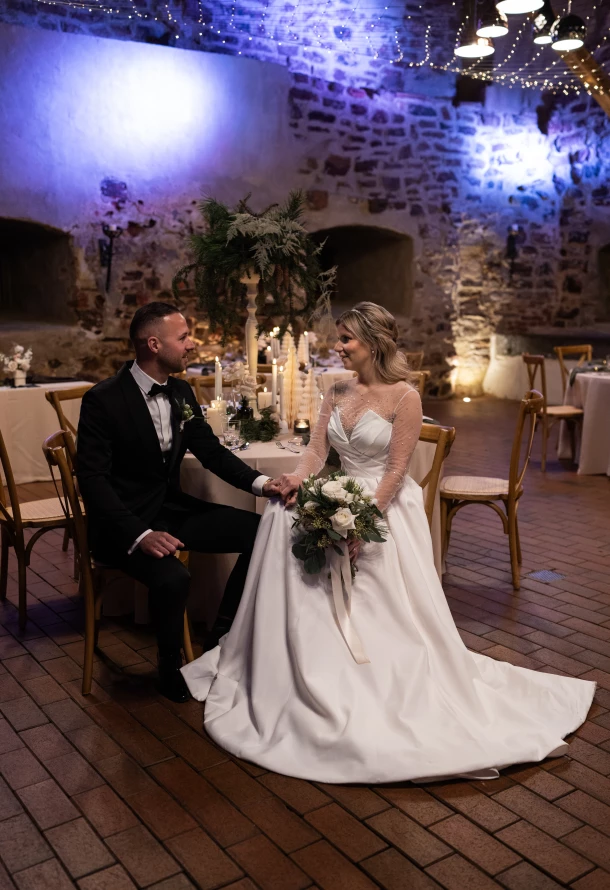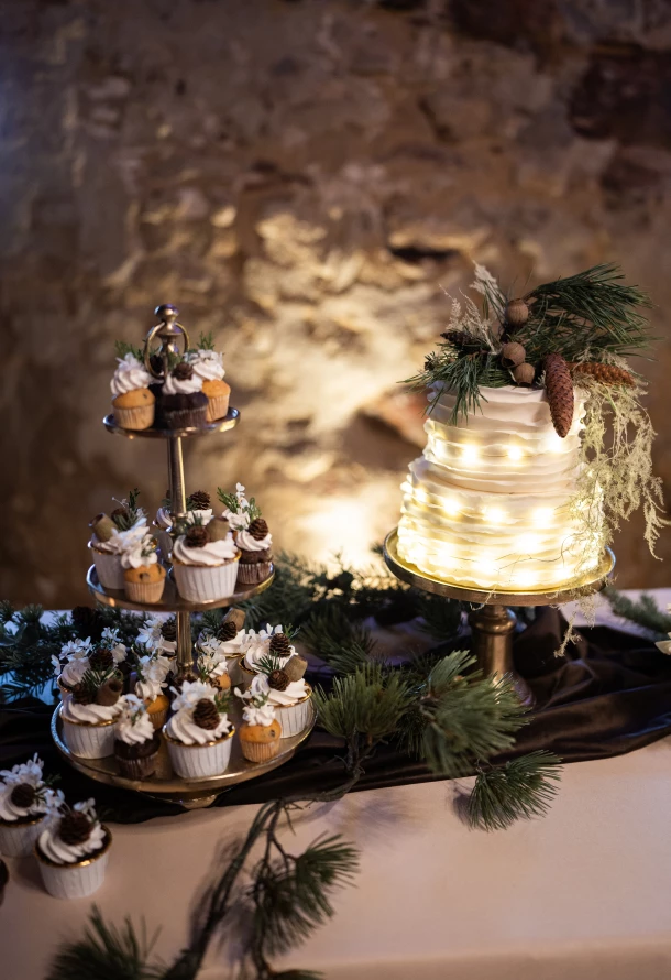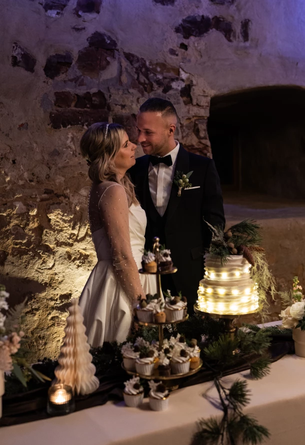 Bereits beim betreten der Location lag ein Zauber in der Luft. Die winterliche Dekoration mit Kerzen, Tannenzweigen und stilvollen Akzenten schuf eine festliche und zugleich gemütliche Atmosphäre, die perfekt zur Jahreszeit passte. Mit einem traumhaften Blick auf den Burgturm fand die freie Trauung unter freiem Himmel statt. Die Feier fand in der winterlich dekorierten Burgscheune statt.