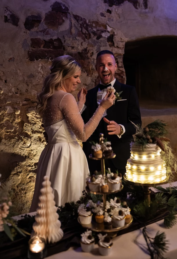 Ein Höhepunkt des Abends war der Tortenanschnitt als Dessert bei romantischem Abendlicht. Die wunderschönen Bilder auf der Burg Staufeneck sind im Rahmen eines Portfoliodays entstanden, bei dem ich mich als Fotografin und meine Ideen für das neue Jahr 2025 weiterentwickeln konnte.